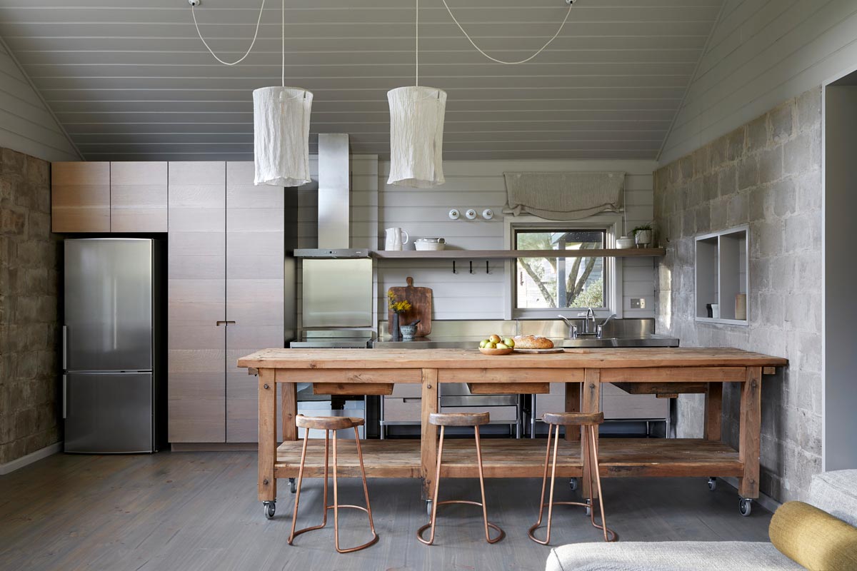 “The building envelope of concrete block walls retain the raw agricultural nature of the former dairy. The insertions within this envelope are joinery and furniture which are of a hand-made nature and are offset with a homogenous wash of calm muted grey tone stains and paints applied to re-used and reclaimed timbers. An intentional approach to reminisce about the rawness and beauty of a previous quintessential Australian architectural typology.” – Rachcoff Vella Architecture