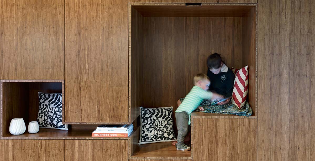 The design integrates new exterior decks into the daily rituals inside the house. The central kitchen and dining spaces were completely remodelled to provide new vertical circulation and remove inefficient split levels inside the home. Further emphasis was also placed on providing a material palette that integrated with the existing rustic exposed timber surfaces. The materials included sustainably sourced spotted gum, radiate pine and reconstituted bamboo.
