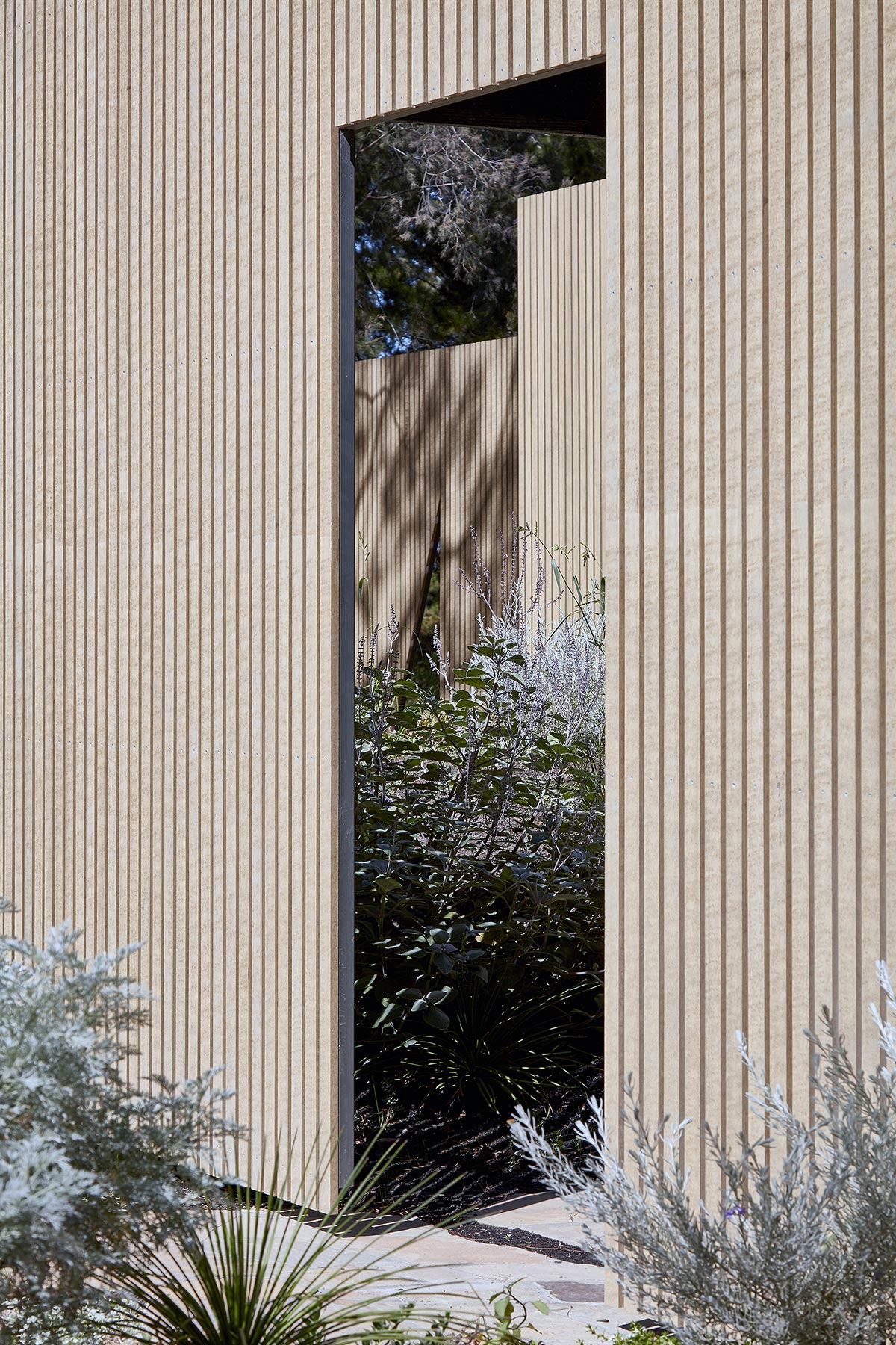 To provide an undefined edge that interacts with and diffuses into an elegantly landscaped front garden, three timber screens were utilised to wrap the facade of the house. The screens further change in appearance as light conditions change throughout the day and seasons. The shadows and light reflected by these panels appear very similar to that of trees, invoking a natural serene ambiance to the space.