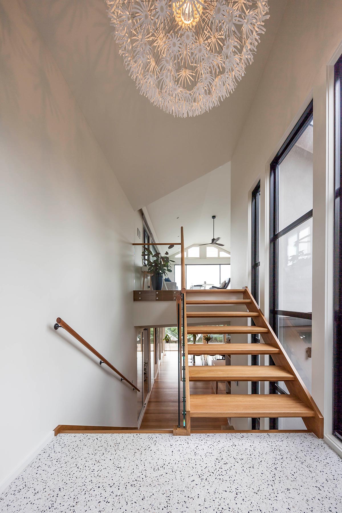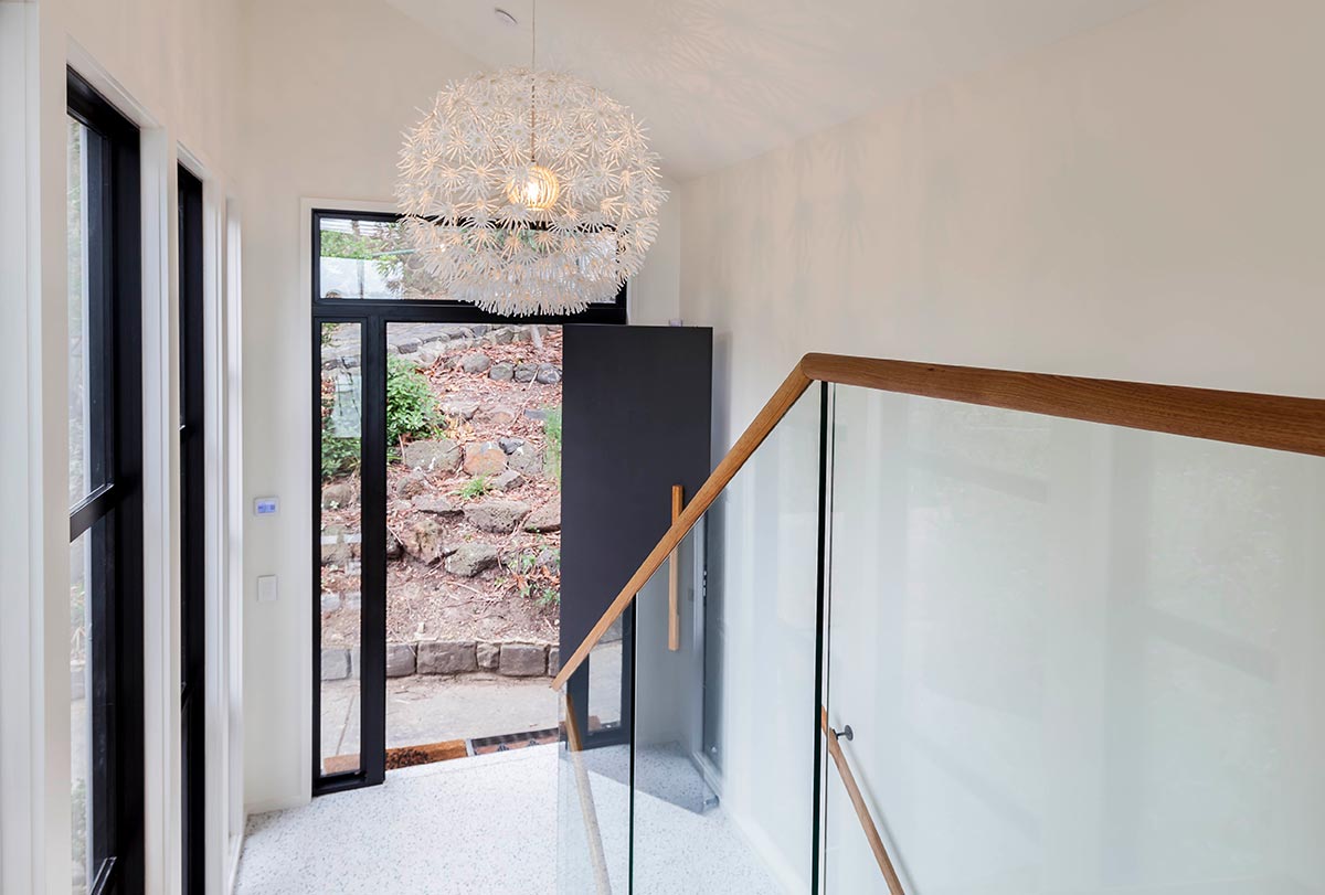 “The site provided quite the challenge, it has beautiful sweeping views across the outer east of Melbourne, however, it is very steep. The house also had several entry points, however no real sense of a focal point ‘front door’. One of the key goals was to improve access from the driveway to a formal front entry. More living space for growing children and guest accommodation for overseas visitors were also on the wish list.” – Detail 9 Architects