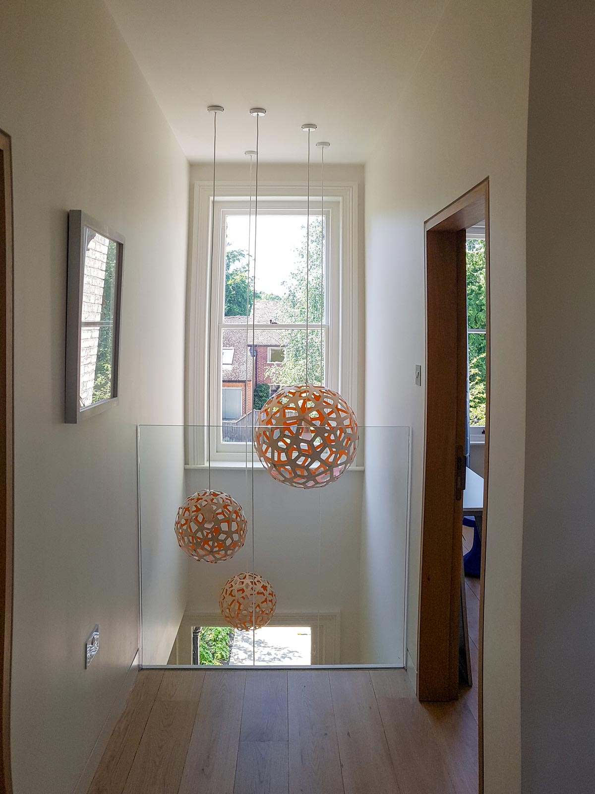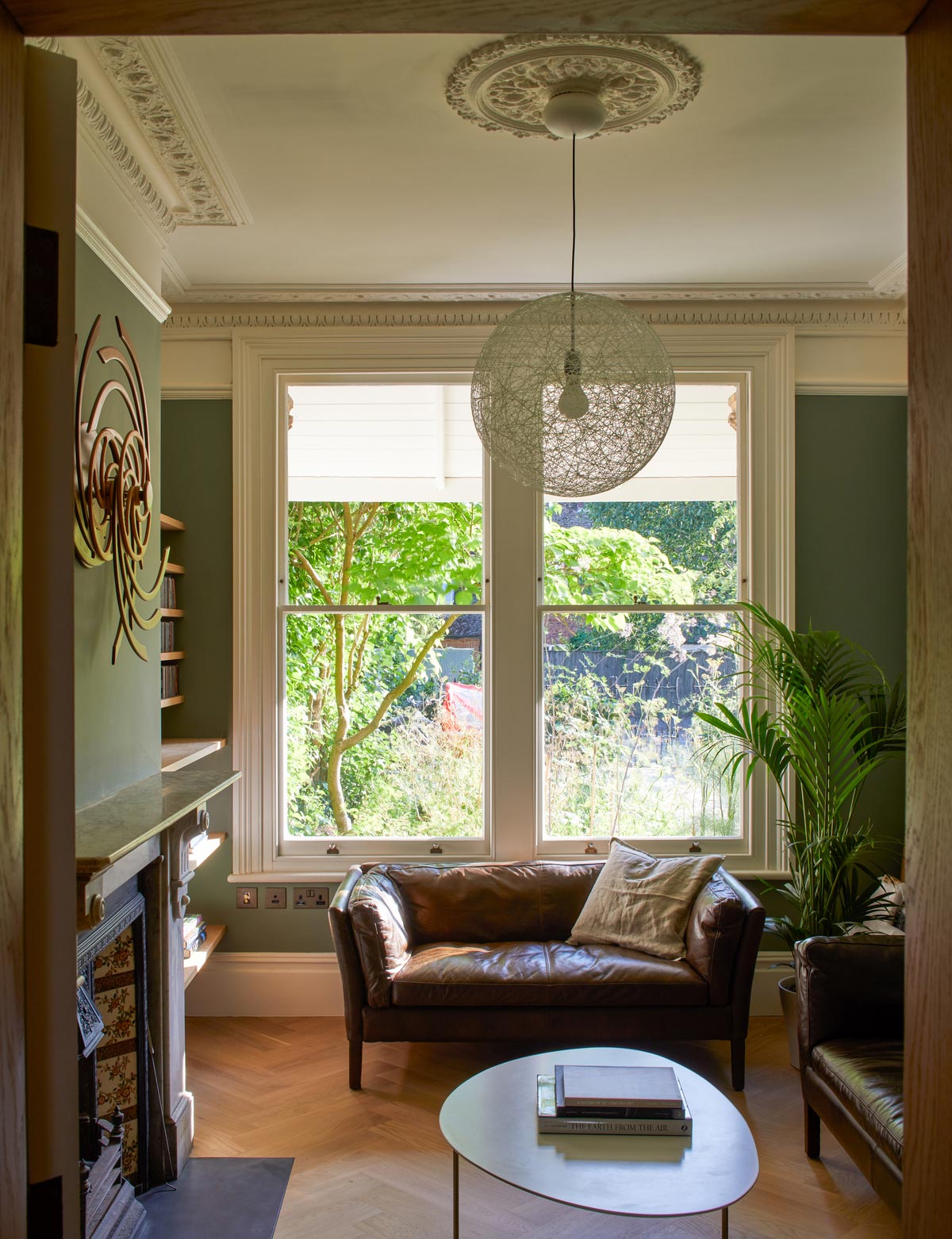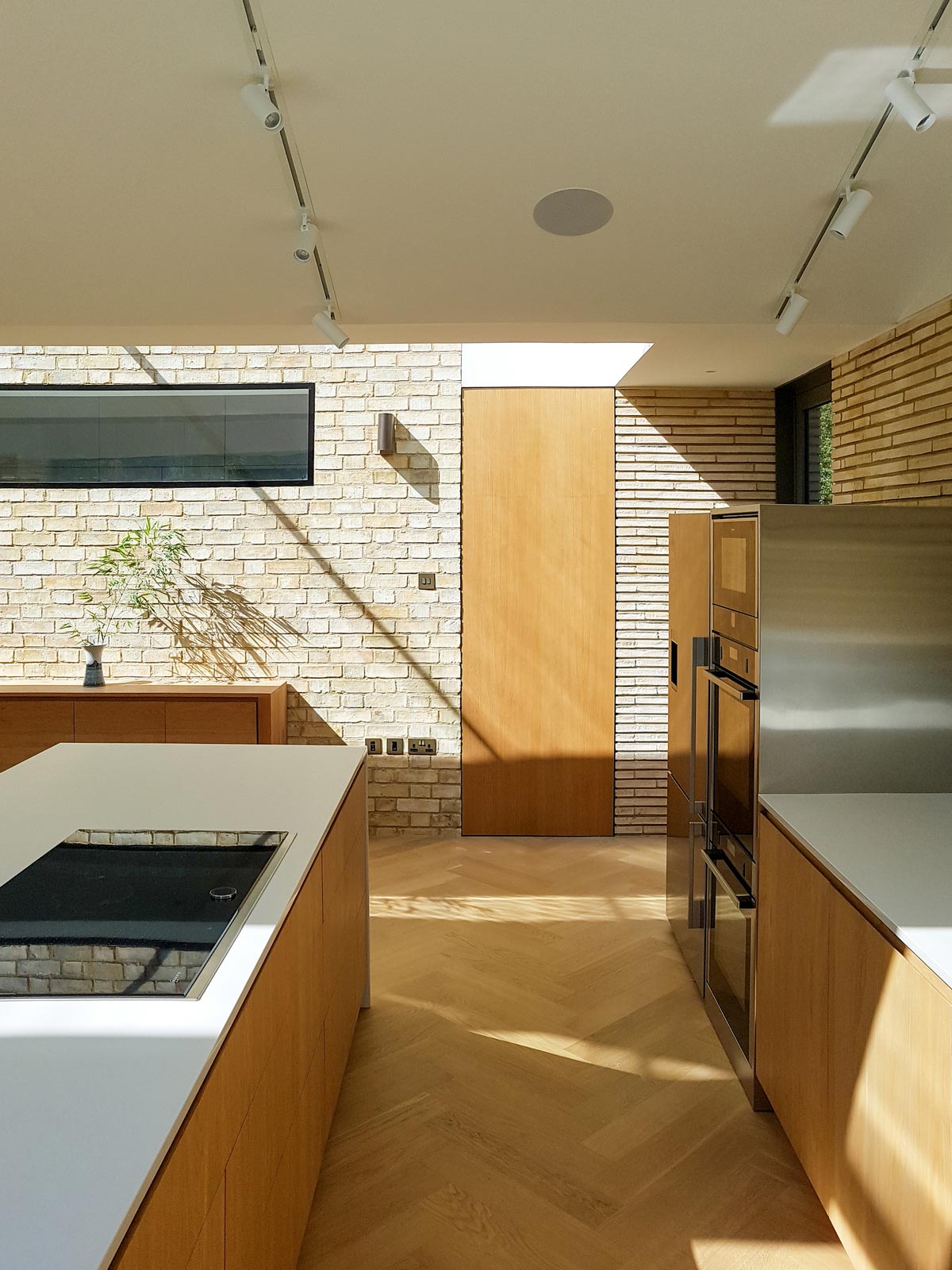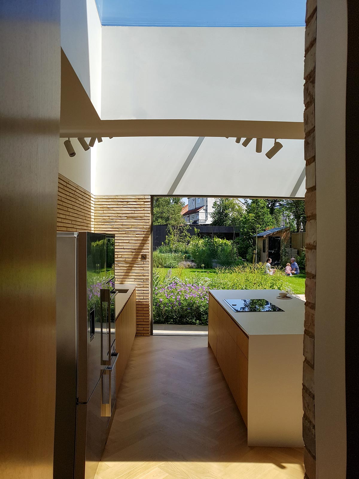 Using computer-aided solar studies and physical models, the shape of the extension has been carefully built to create a naturally illuminated north-facing rear extension, maximizing light through a rear glazed façade and carefully placed skylights. The sloped roof of the rear extension was designed using daylight analysis software to minimize the effect on neighbouring properties’ light while maximizing natural light and allowing views of the current façade as one moves from the corridor spaces to the open plan kitchen/dining spaces.