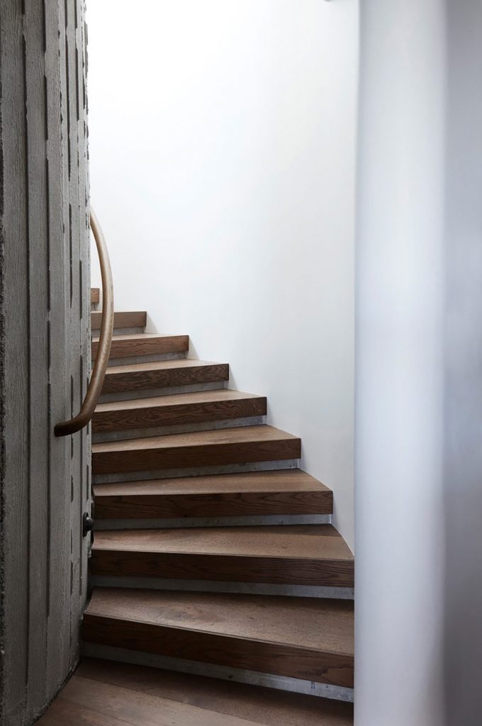 A pivot point of each floor of the house is formed by the elliptical concrete that allows for a sturdy base, providing a strong anchor. Leading to the garage level is a stair that’s wrapped around a lift core that descends to create a consistent link between all areas of the house.
