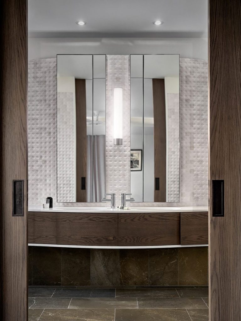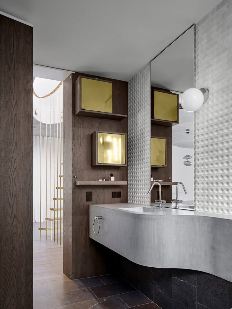 The living space has a sacred open-plan arrangement, having only the brass stairs act as a subtle divider between the dining and the living room, while creating a sense of privacy from the kitchen area. A moveable bookcase opposite the fireplace leads to the Calligrapher’s study area that instantly offers a direct view to the pool.