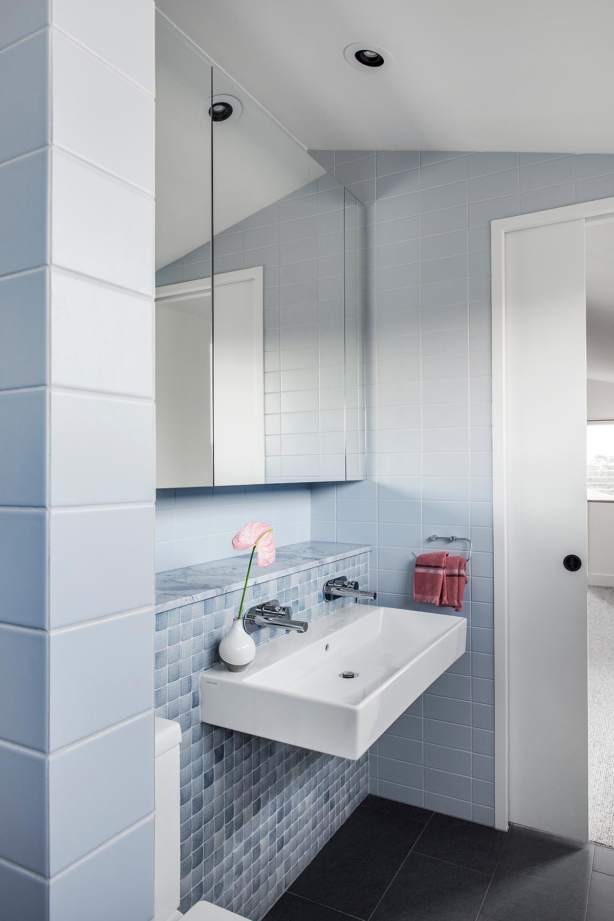 “Durability and low maintenance are key to this design. Due to the limited access around the dwelling and tall elevations, the external materials palette is very simple. Aluminum cladding with a horizontal pattern – a subtle reference to the vernacular weatherboard. Composite battens with the benefits of timber, without the maintenance. Plus louvred windows, adding texture yet easy to clean, both inside and out! A similar luxe yet low care theme was pursued internally, with oak flooring and feature walls, soft-toned natural stone and the gentle use of colour with warm greys and blues.”