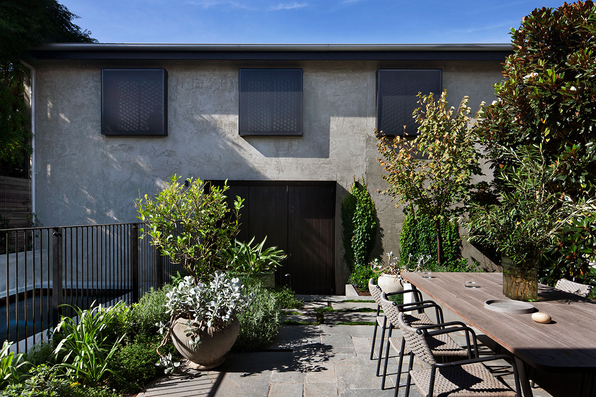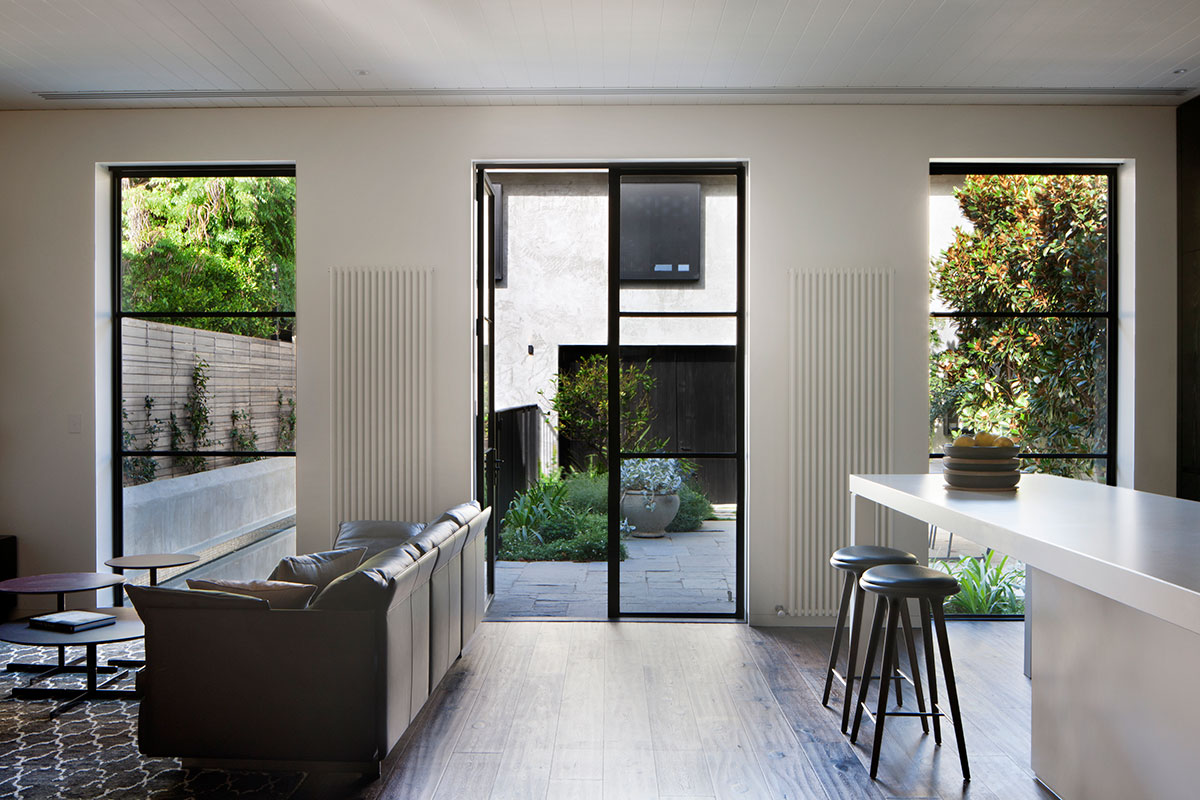 “Prior to renovating, the home’s rear living and kitchen area looked onto a dreary courtyard and garage cum studio, and the improvement of this outlook was central to the design intent and has proven to be integral to the success of the renovation. We felt that the relationship of the house, studio and garden needed to be harmonised to all three’s mutual benefit. This has been done by employing a few elementary techniques to declutter and simplify the previously fragmented layout and by focusing on the views from the interiors to the courtyard gardens.” – Hindley & Co