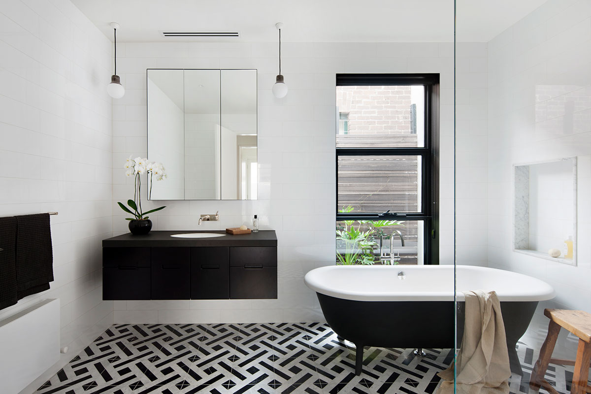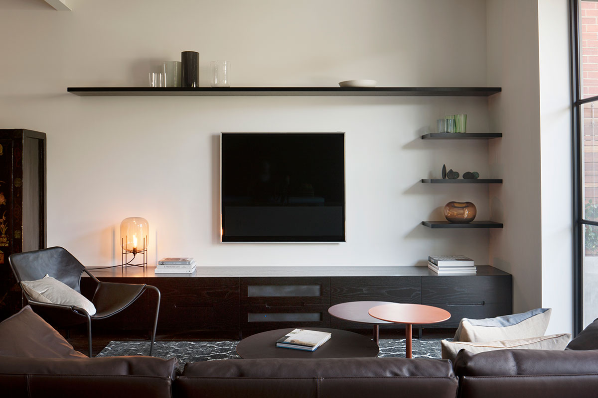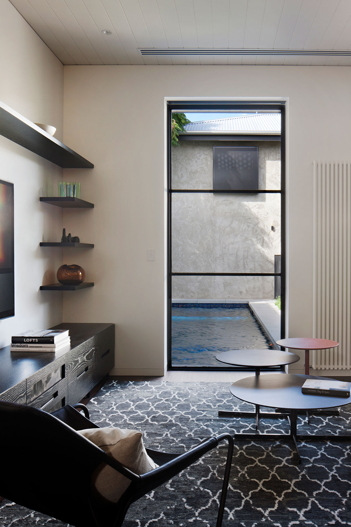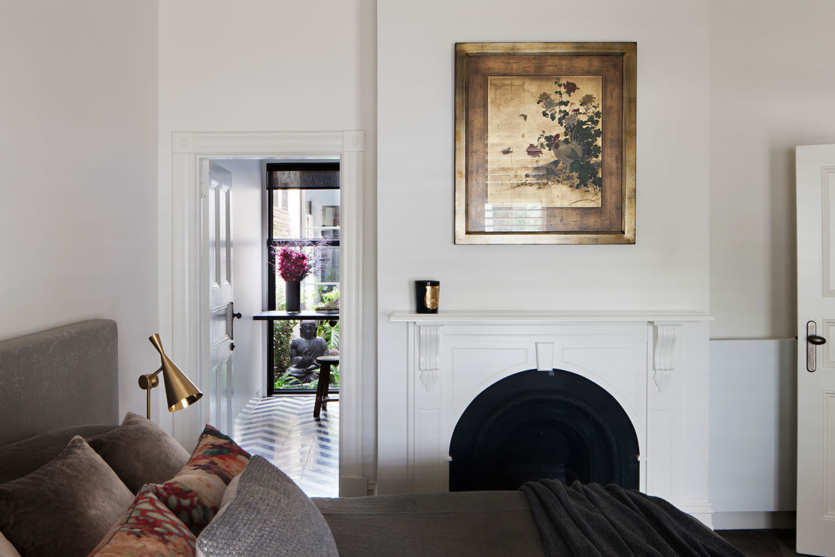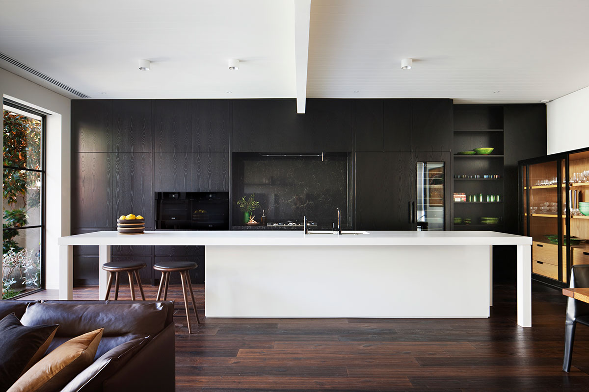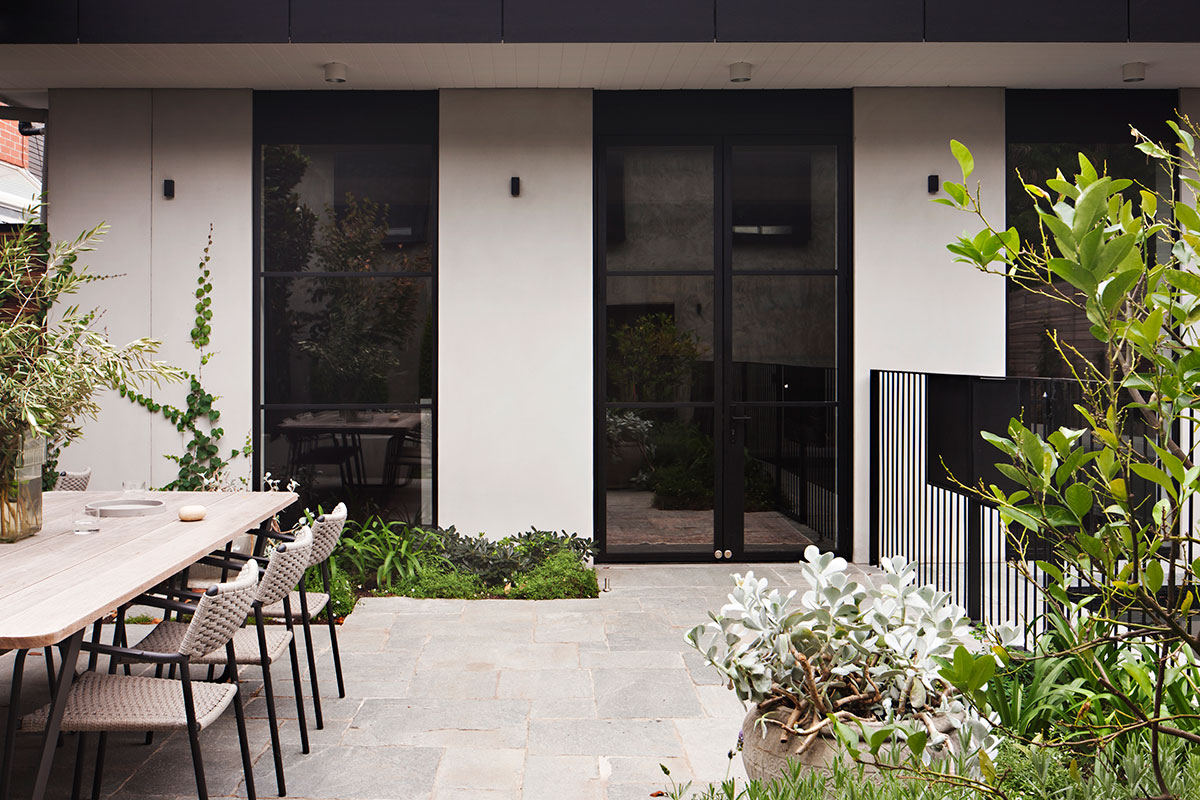 “While the shell of the Victorian terrace was retained, there were some planning changes including the addition of an ensuite and dressing room, as well as the demarcation of the threshold between the private spaces at the front of the house and the more public ones at the rear, by way of steel-framed doors. A palette of black and white, chocolates and neutrals unravels from the kitchen to the living area and master bedrooms. In the bathrooms, the layering of transparent surfaces, such as the shower screens and hanging mirrors produce a trompe-l’oeil effect by reflecting the lush green outside.” – Hindley & Co