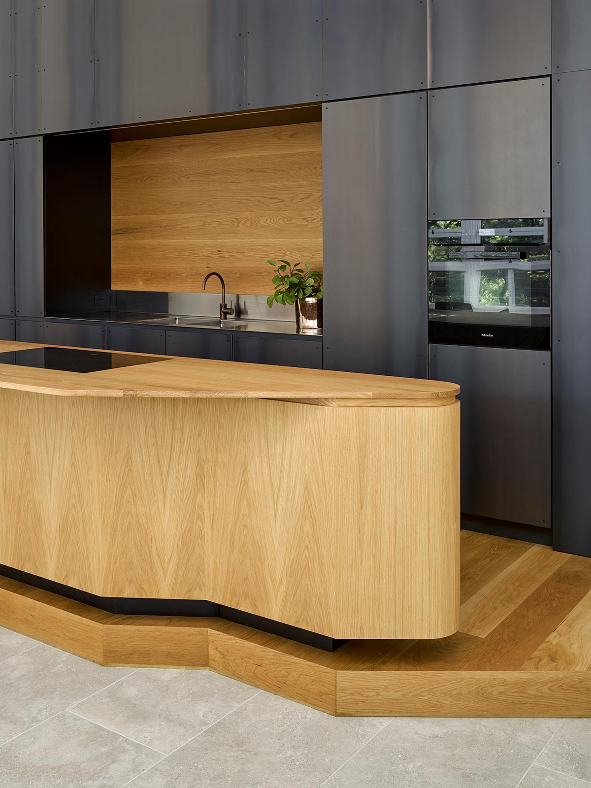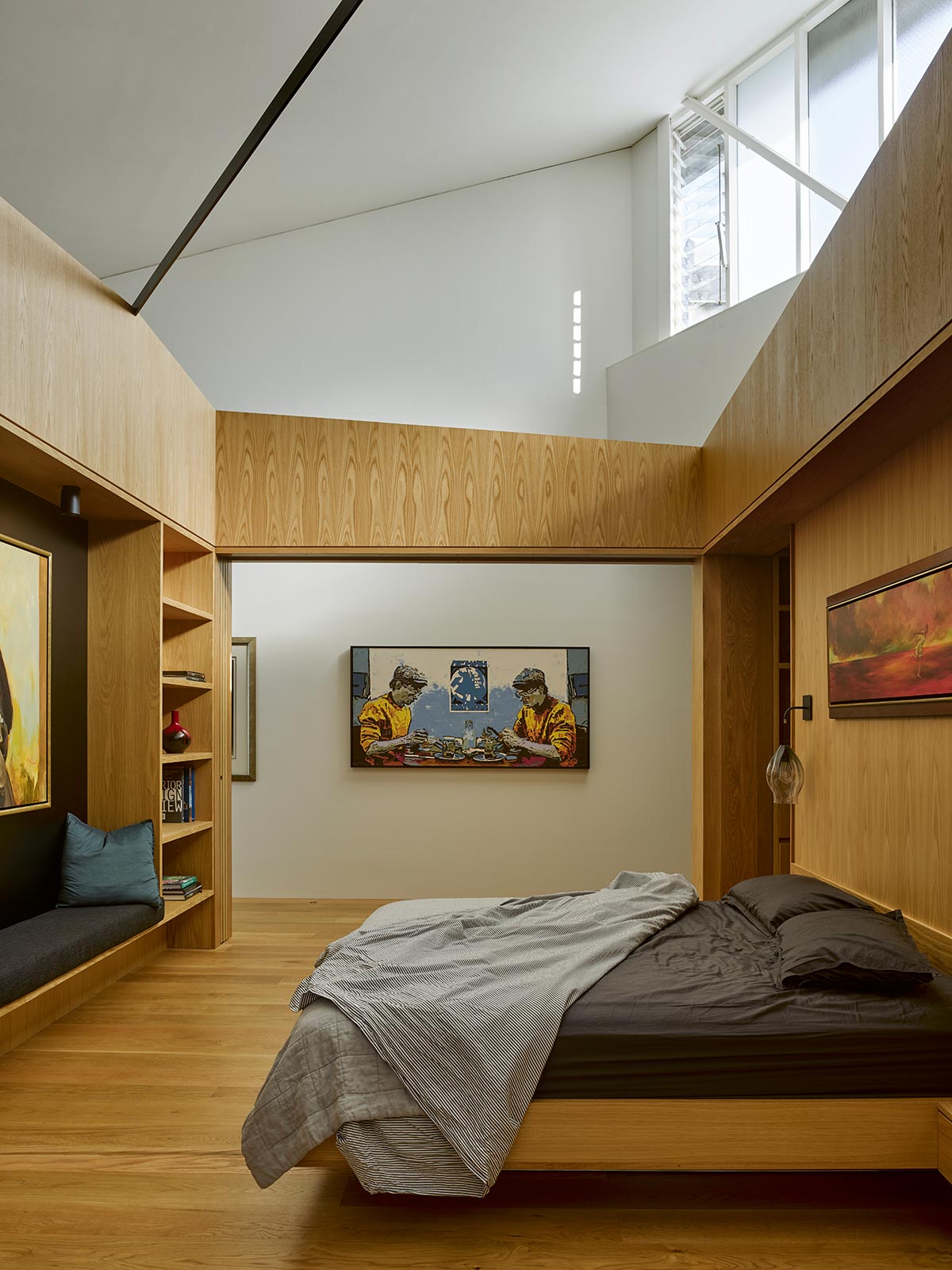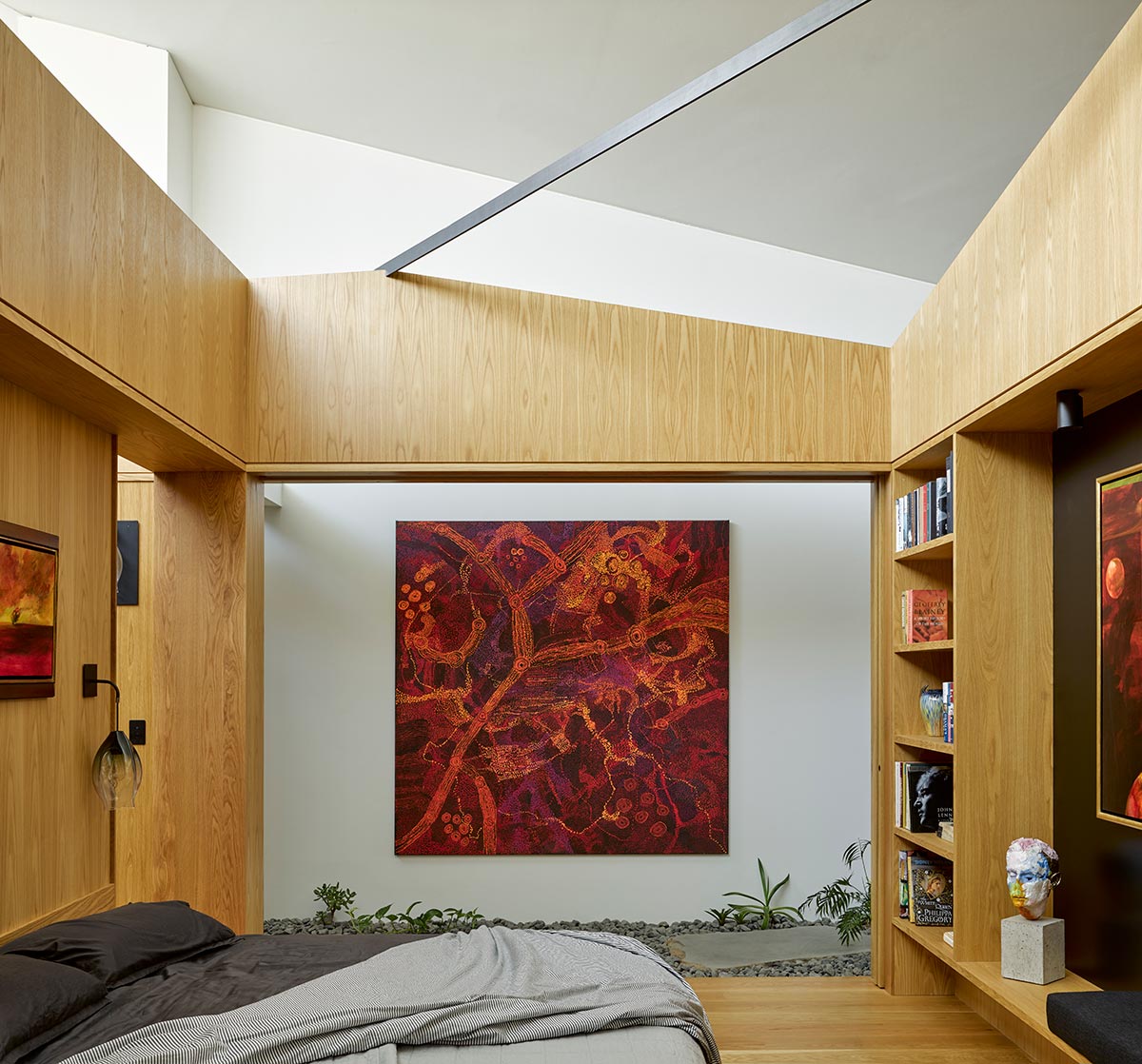 “The industrial aesthetic of the hot rolled steel plate cladding around the cocoon contrasts with the warmth of timber detailing to provide a strong, sculptural counterpoint to the light (and art!) filled the gallery space of the original shell. Floors throughout the apartment vary not just in levels, but in materials as well. Along one side an indoor, Japanese inspired, pebble garden is created complete with an ‘outdoor’ shower.” – Sparks Architects