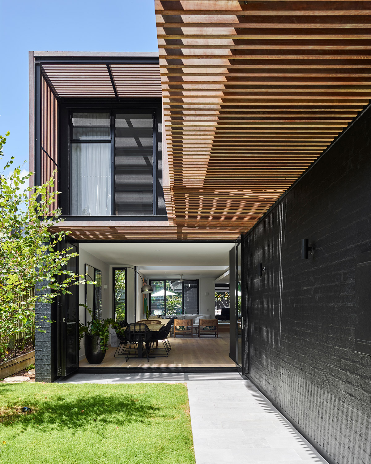 Another major change was the redesigning of the front facade and the inclusion of the balcony. Extruded timber screens were utilized to provide sun protection and privacy whilst also providing a dramatic street appearance and covered connection to the house from the street. This alteration gave Barlow House a new identity.