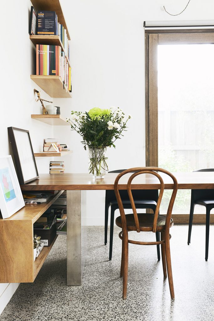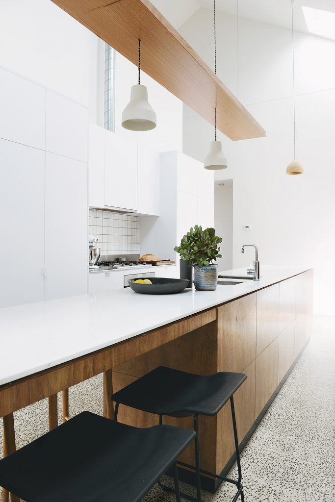 Once inside you are greeted with light, lots and lots of light! The Barny in Bank Street house has a very small footprint of just 100sqm, so to make it feel more spacious Nest Architects featured 6m tall pitched ceilings and an open mezzanine located over the bedrooms and bathroom. Clear roof windows in the ceiling allow you to see sky from everywhere in the house, which is a rarity in Brunswick!