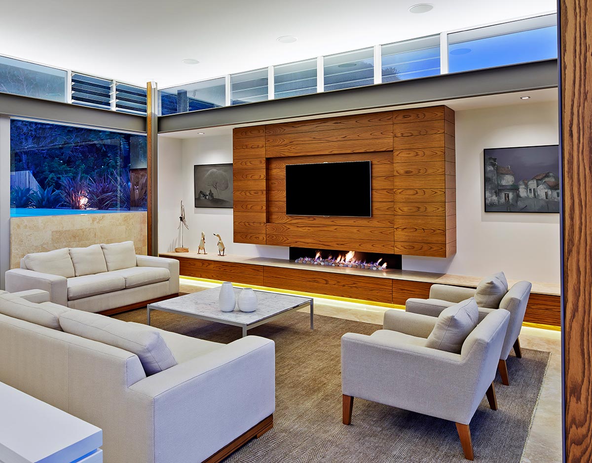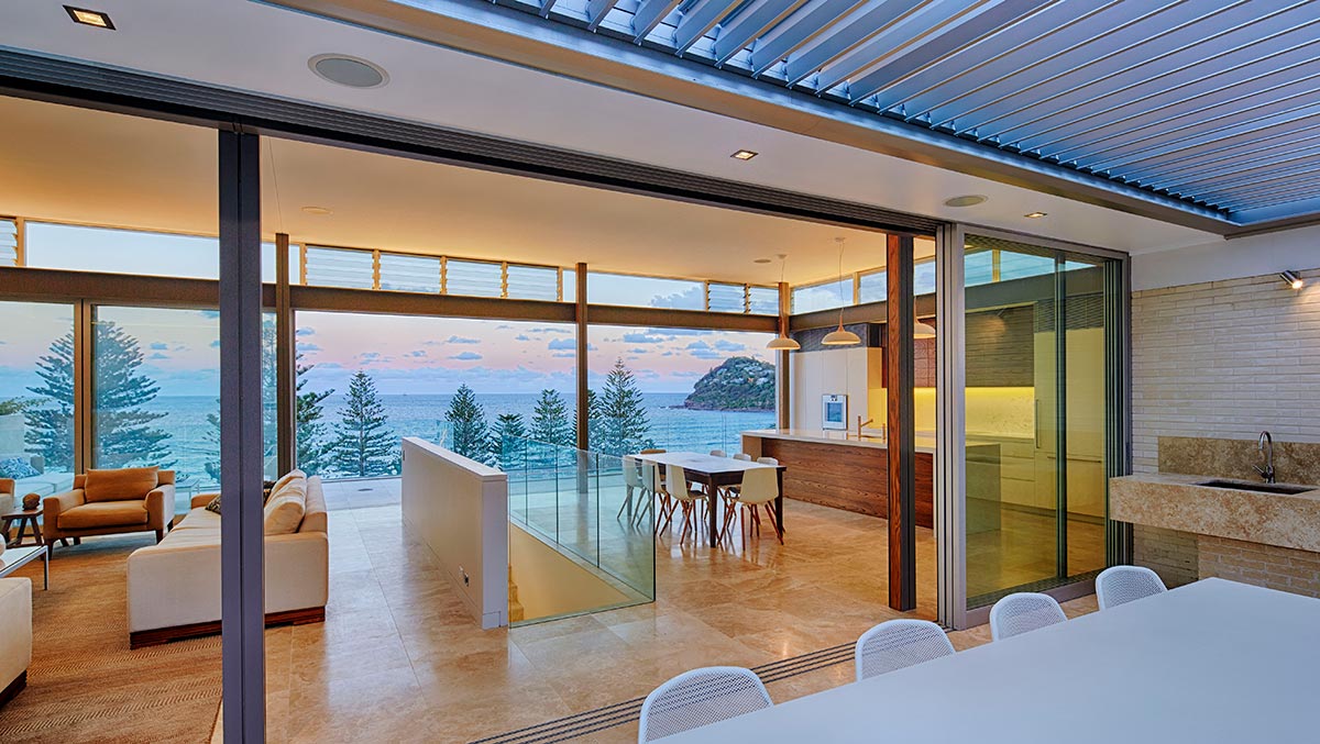 Elements from the exterior continually flow to the overall interior. The palette of materials includes natural limestone, cream-coloured face bricks, natural anodised aluminium and off-white rendered walls which are all neutral in colour and allow the view to take centre stage. The choice of material gives off a warm and cosy ambience to reflect the beachside lifestyle. The Louvretech operable roof over the outdoor dining allows for year-round enjoyment.