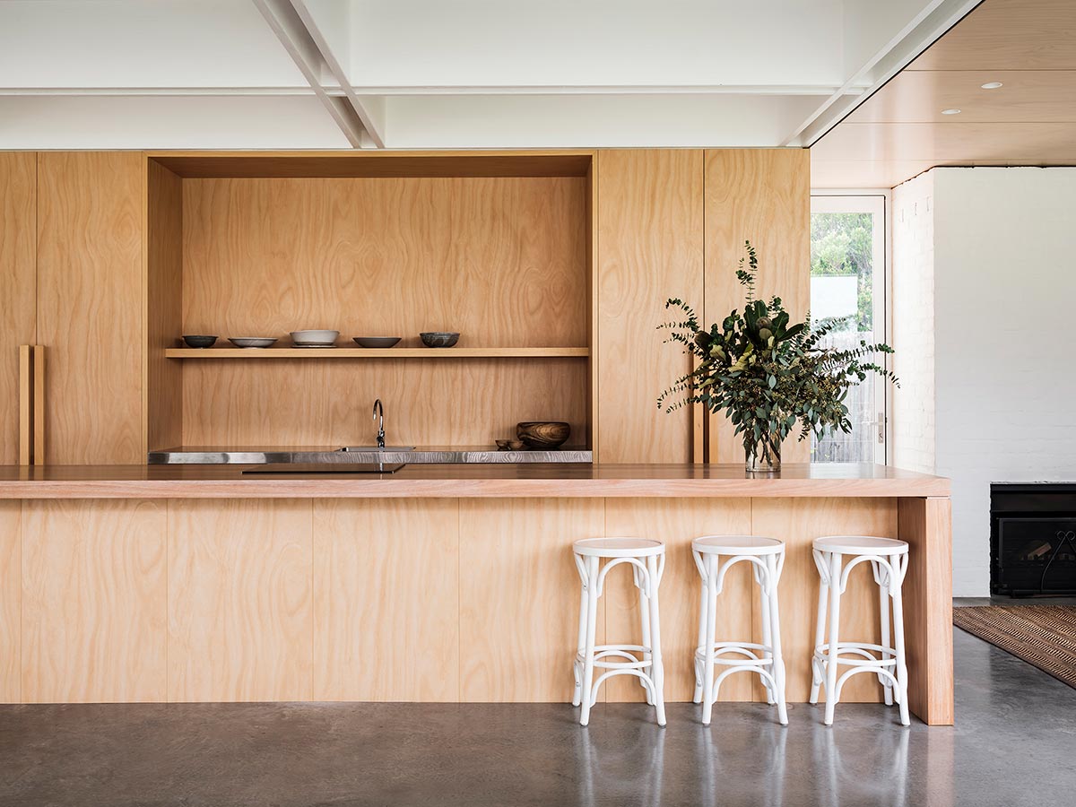The structure exists harmoniously with its natural environment, rather than dominating it. Timber screens were intended to play on the surrounding gum trees and blend into the bush setting. Every room has good cross ventilation and materials are sustainably and locally sourced where possible, including the timber kitchen bench and ply elements. It also has a concrete floor which acts as a heat sink, eaves to all sides and screens to manage eastern and western sun.