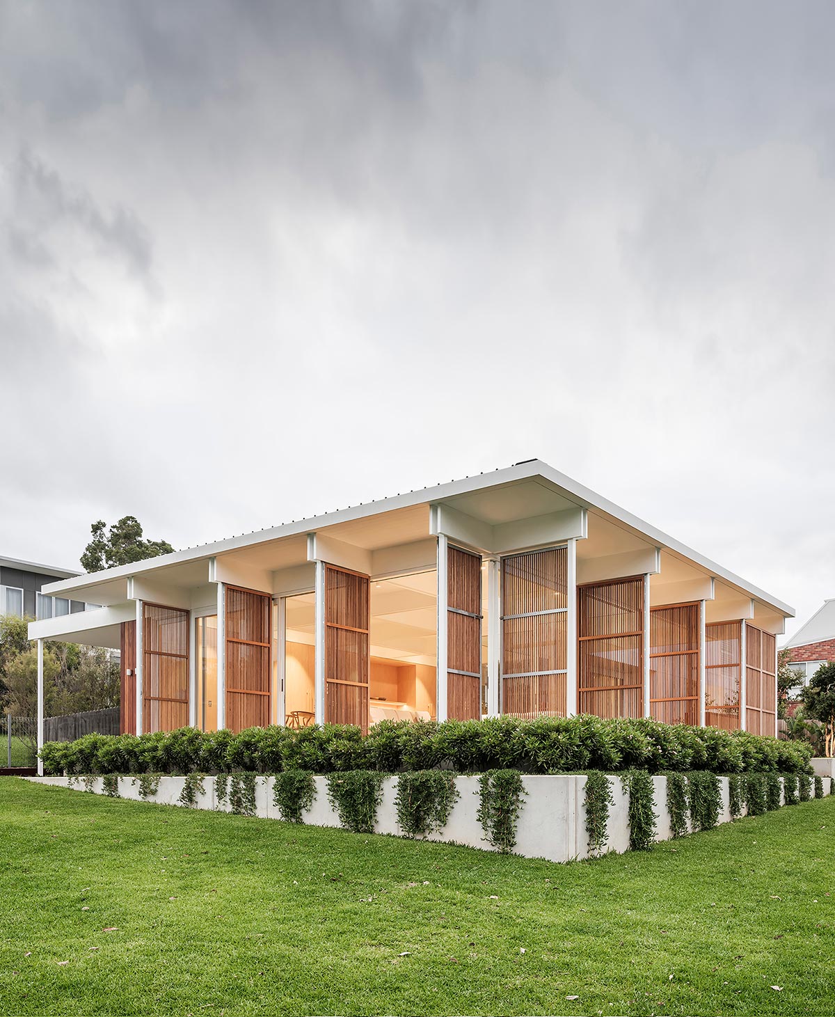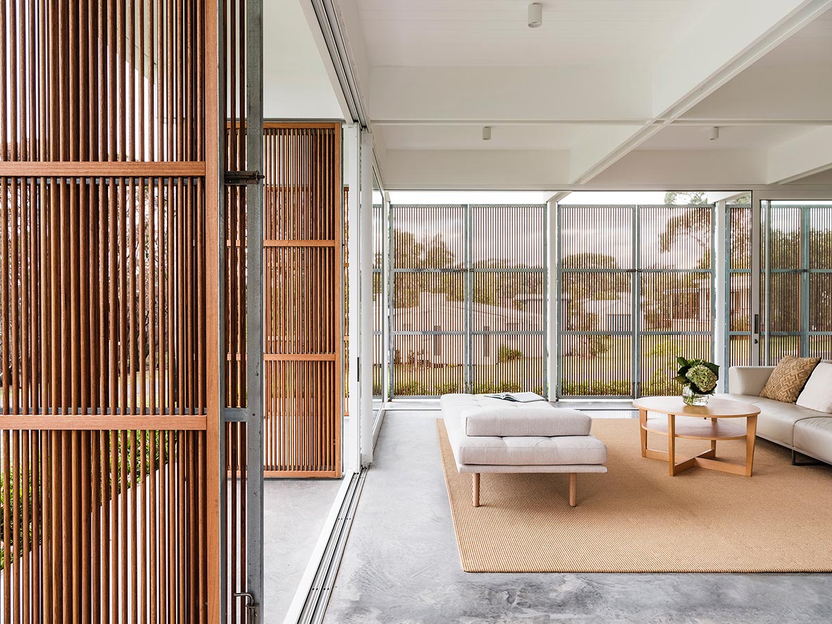 The coastal town of Bendalong has one access road and beaches on either side of the headland, so connection to the outdoors and landscape was imperative to the design. Operable timber screens don’t only offer protection from the elements but also allow for the control of privacy and when the whole house is opened up it almost disappears, evoking the social mood of camping.