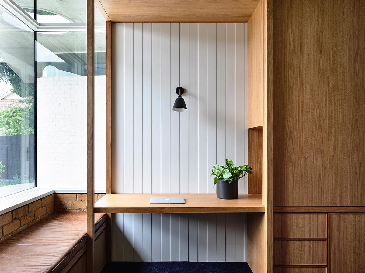 “The proposed extension is located along the south of the site providing expansive north-facing windows and doors supplying natural light to all rooms as well as important connections to the rear yard. The concrete roof is designed to provide generous eaves that control the sun seasonally. Insulation has been placed on top of the concrete roof and this, as well as its natural thermal mass, ensure the new extension is kept warm in winter and cool in summer.” – Preston Lane Architects