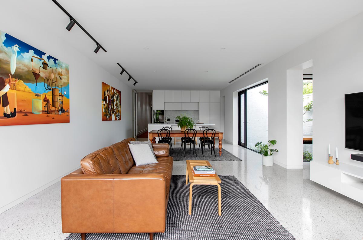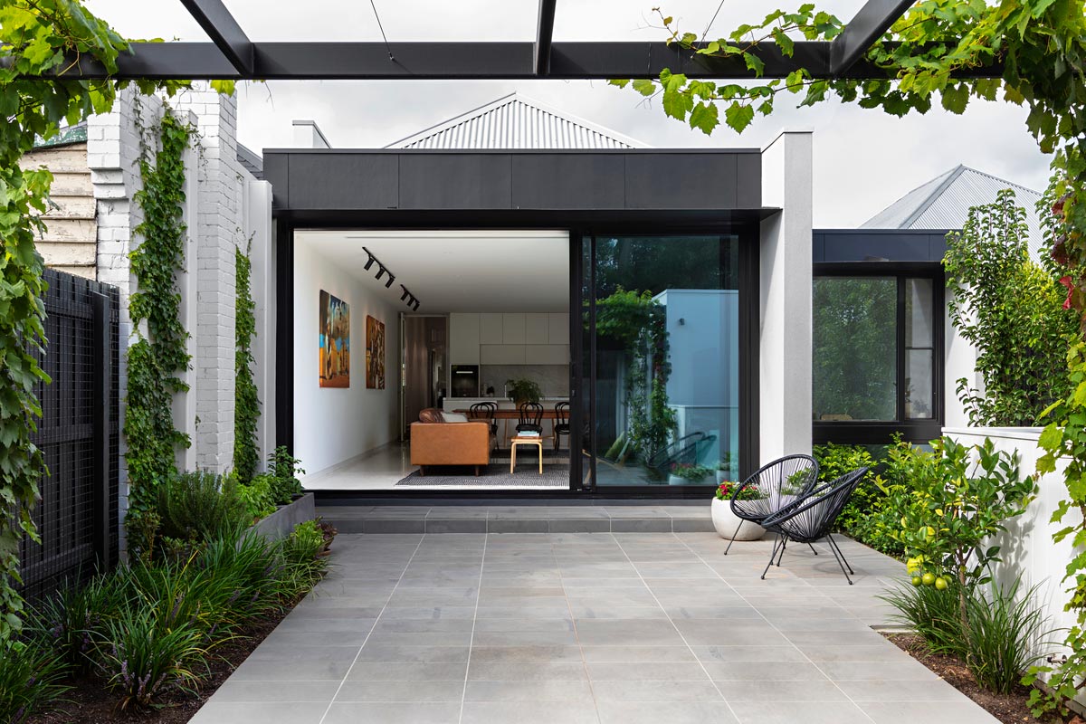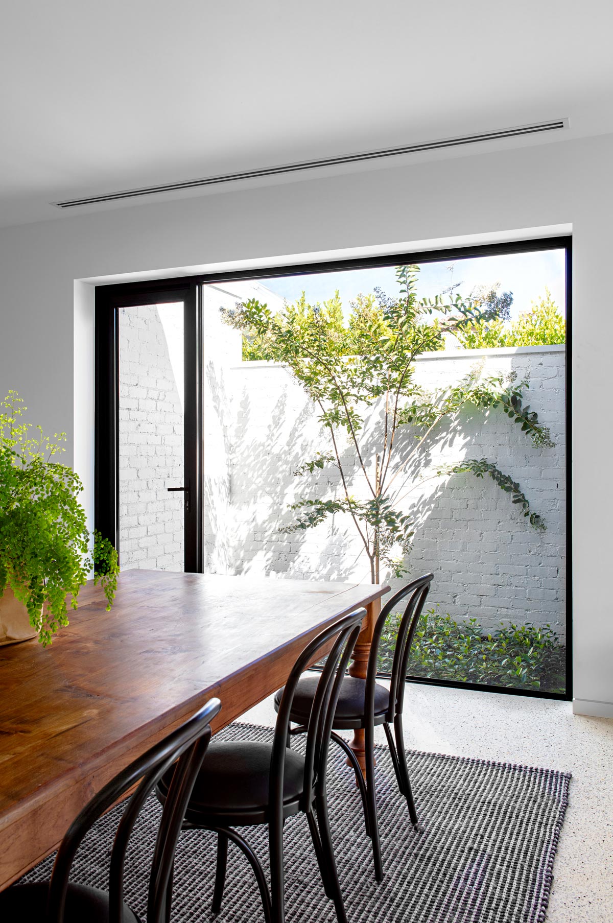 “The original house was highly compartmentalised and had a poor connection to its north facing back garden. The design reworked the back of the original house by consolidating several rooms, opened the rear elevation to the garden and added a smaller ‘service block’ to the side. The service block accommodates laundry, walk in pantry, and study. A central courtyard was introduced into the design to enable dual aspects for the new study and living room and aid in cross ventilation.” – JTA