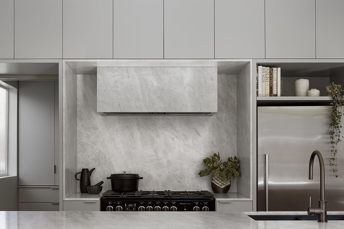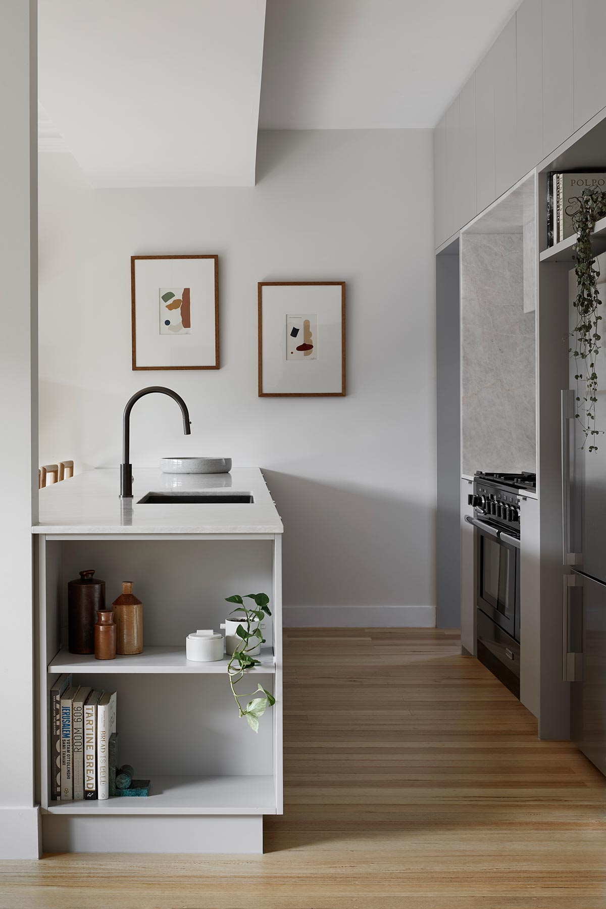 Maximising every millimeter within the restraints is important, so the brief also called for an innovative and dynamic integration of storage. This allows not only for an efficient open plan kitchen, dining and living but also the seamless integration of a pantry. The pantry features a second sink, appliance bench and full height pantry with a combination of under counter drawers and cupboards to address specific storage requirements of the client.