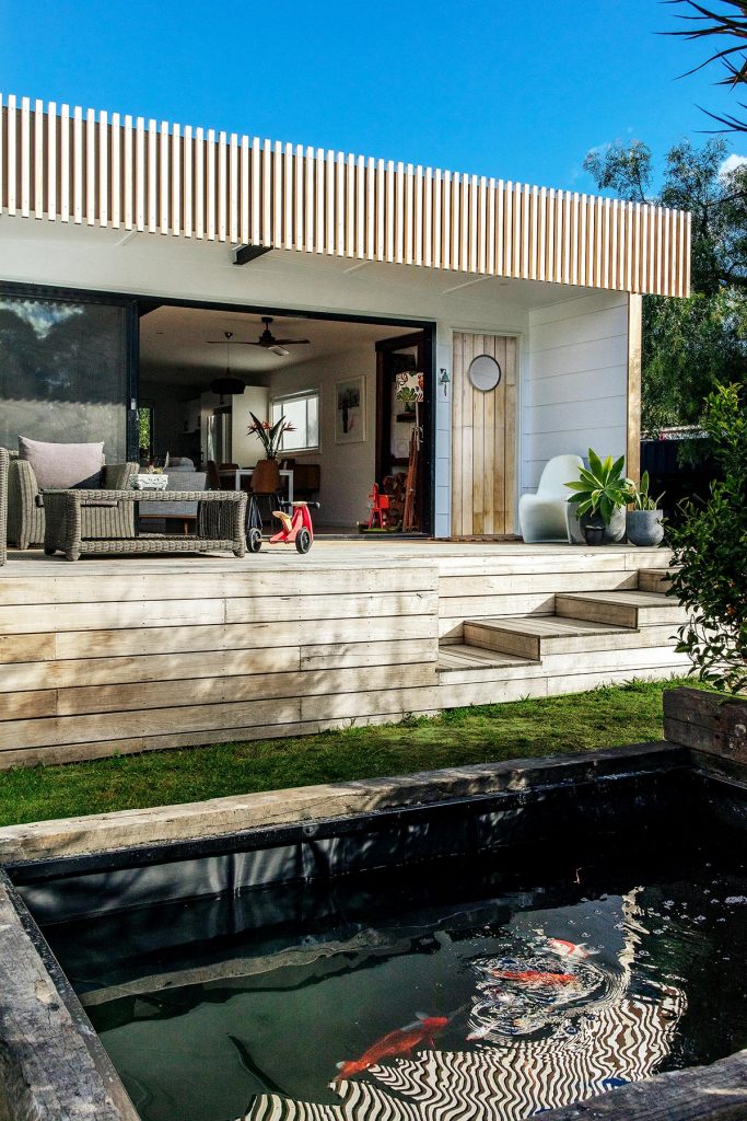 What we find most striking about this design is the seamless integration of old and new. There are familiar, almost nostalgic materials that have been used in a modern setting that help to create warmth and immediately adapt to the surroundings. The horizontal panelling featured on the outdoor deck harks back to classic beach shacks whilst the uniform timber panel feature at the top invites a fresher, contemporary feel.