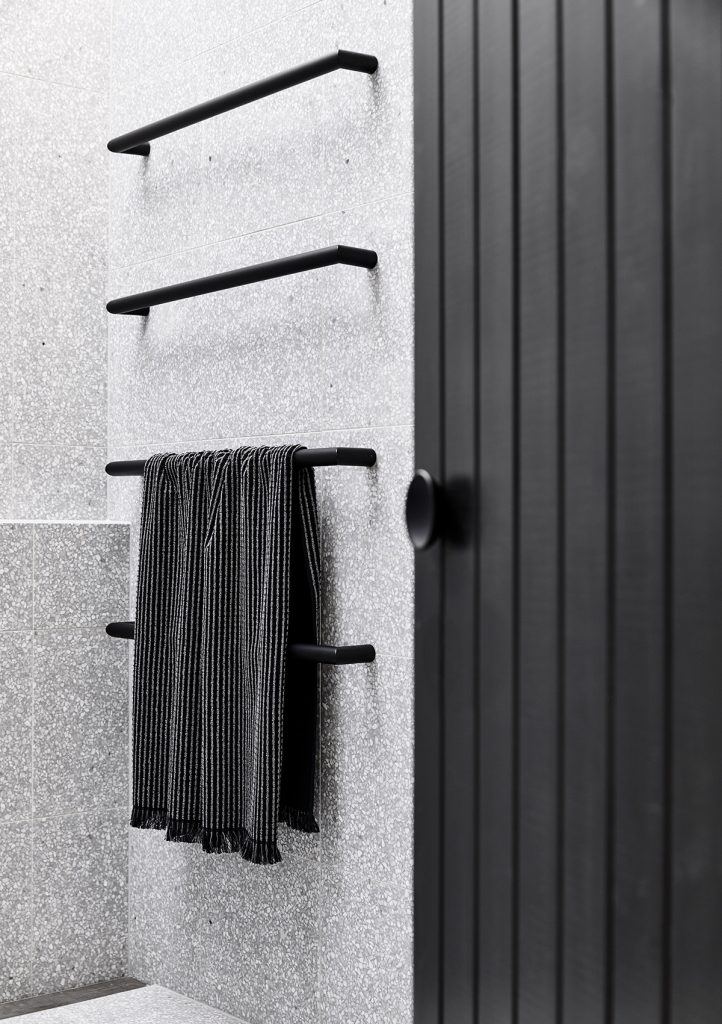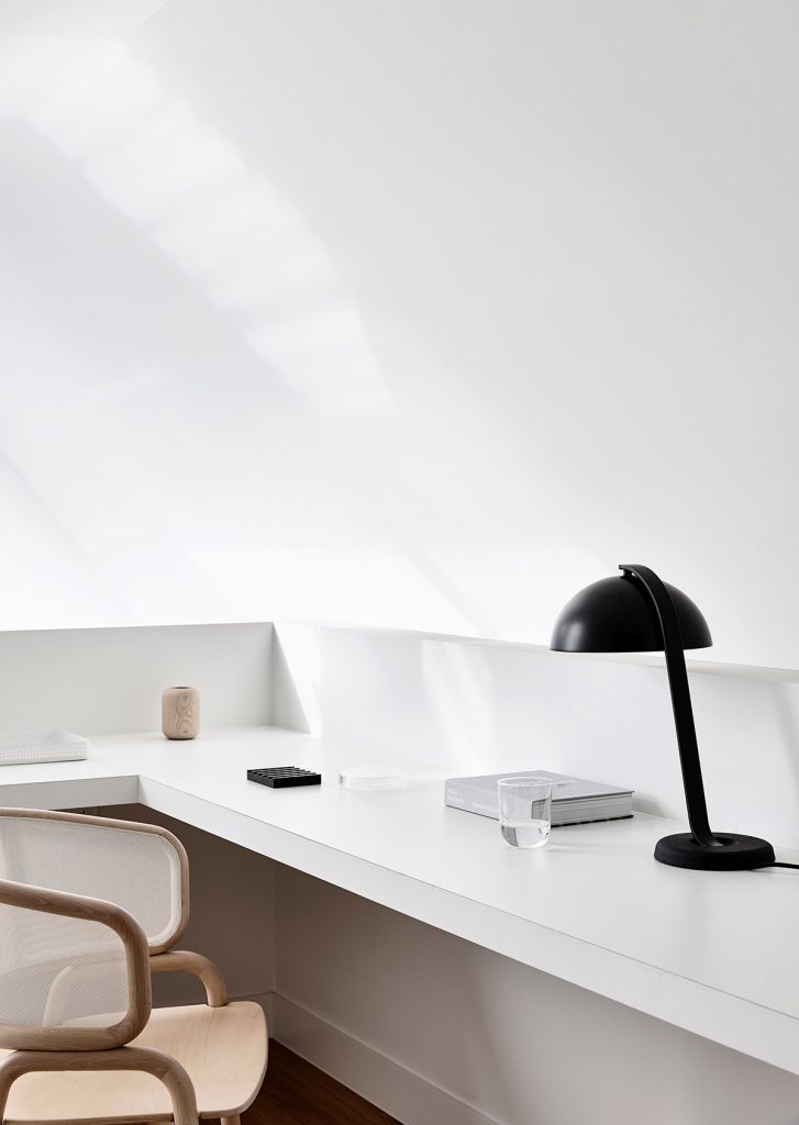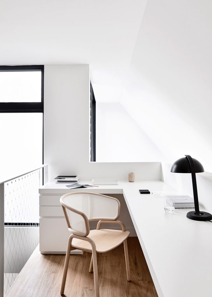 Dealing with a narrow floor plan, the house has packed a hell of a lot in. Height is key to this Carlton Home as the elongated lines take your eye to the sky creating the feeling of space. The interiors boast a simple timber and monochromatic theme, which is signature to the architect Tom Robertson. The living room runs off the open plan kitchen and dining with the home split with a feature staircase, that also helps to create an illusion of space.