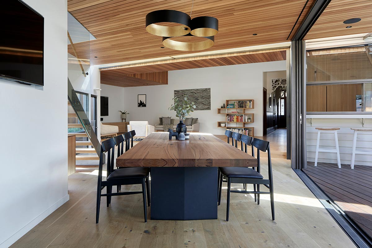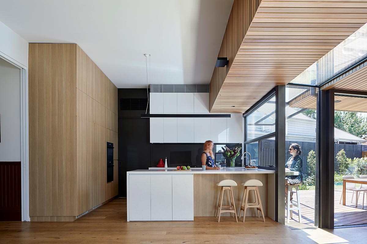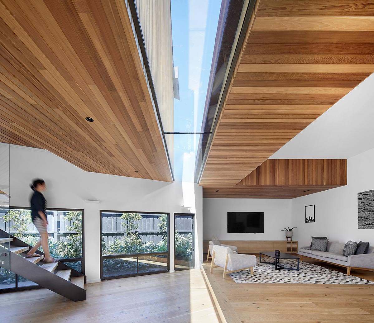 Upon entering the house, the new open space and outdoor areas at the rear guides you through to a dramatic full-length skylight which acts as a subtle boundary between the existing home and the new. It allows natural light to flood in the living areas while at the same time honouring the roofline of the original home.
