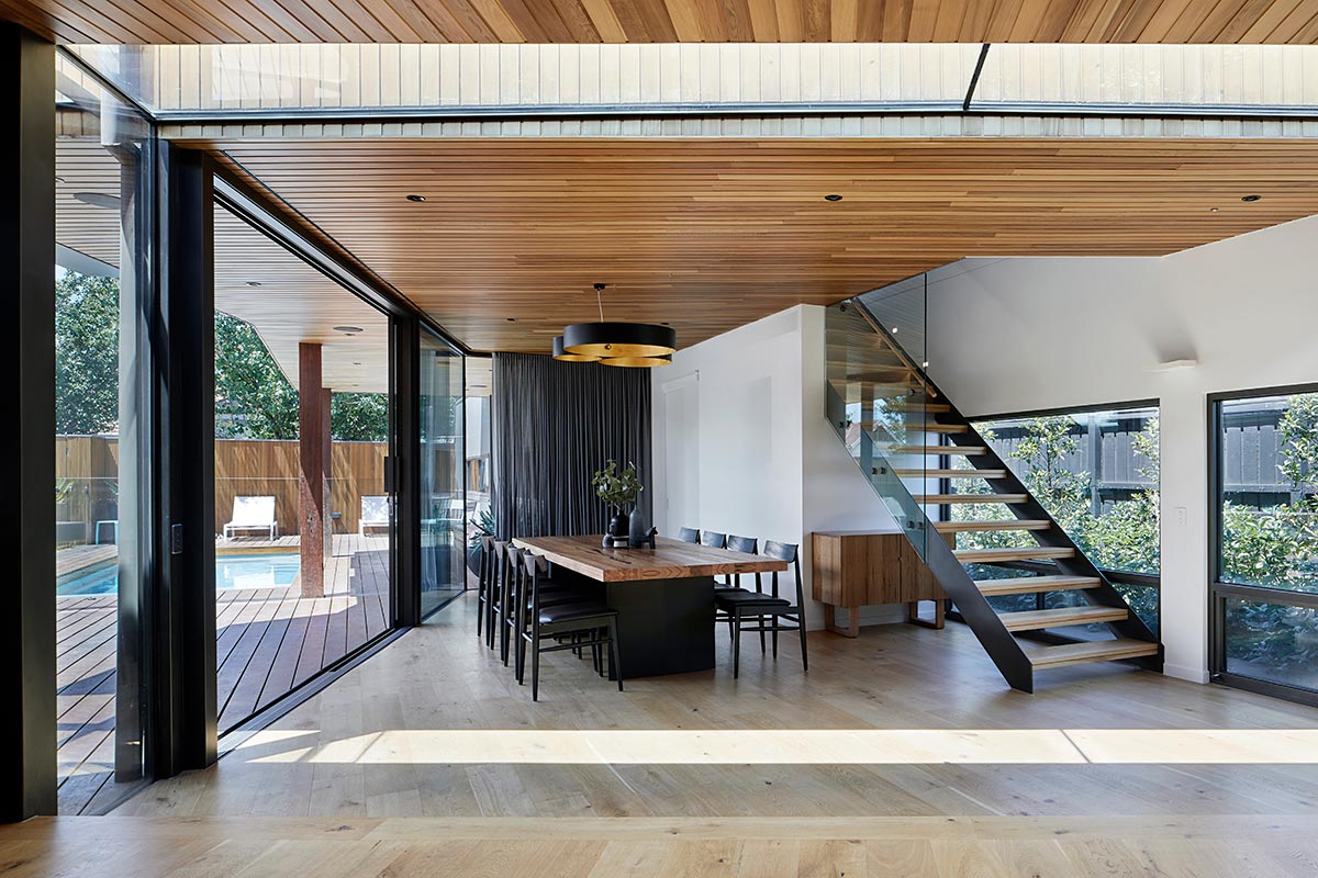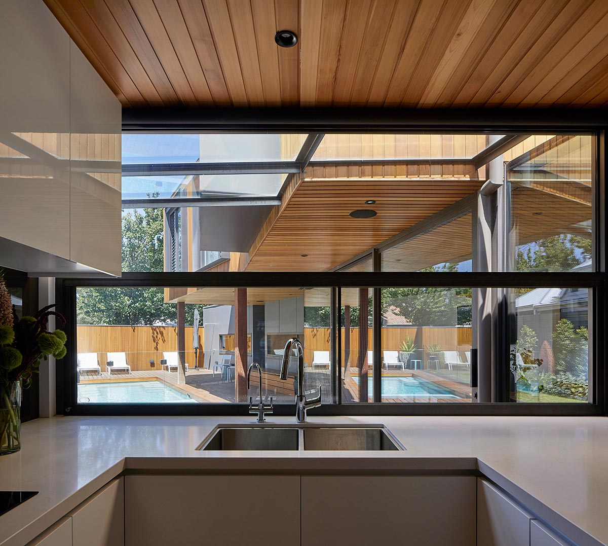 “Just like the work triangle in a kitchen, a triangular relationship between the kitchen, dining and outdoor area helps to create an indoor-outdoor lifestyle for the owners. Large glass sliding doors open the dining area seamlessly onto the deck, while a servery window and breakfast bar connect the kitchen to the outdoors. Even the laundry enjoys a view over the pool and outdoor space, making those must-do domestic duties less of a chore.” – Loke Architects