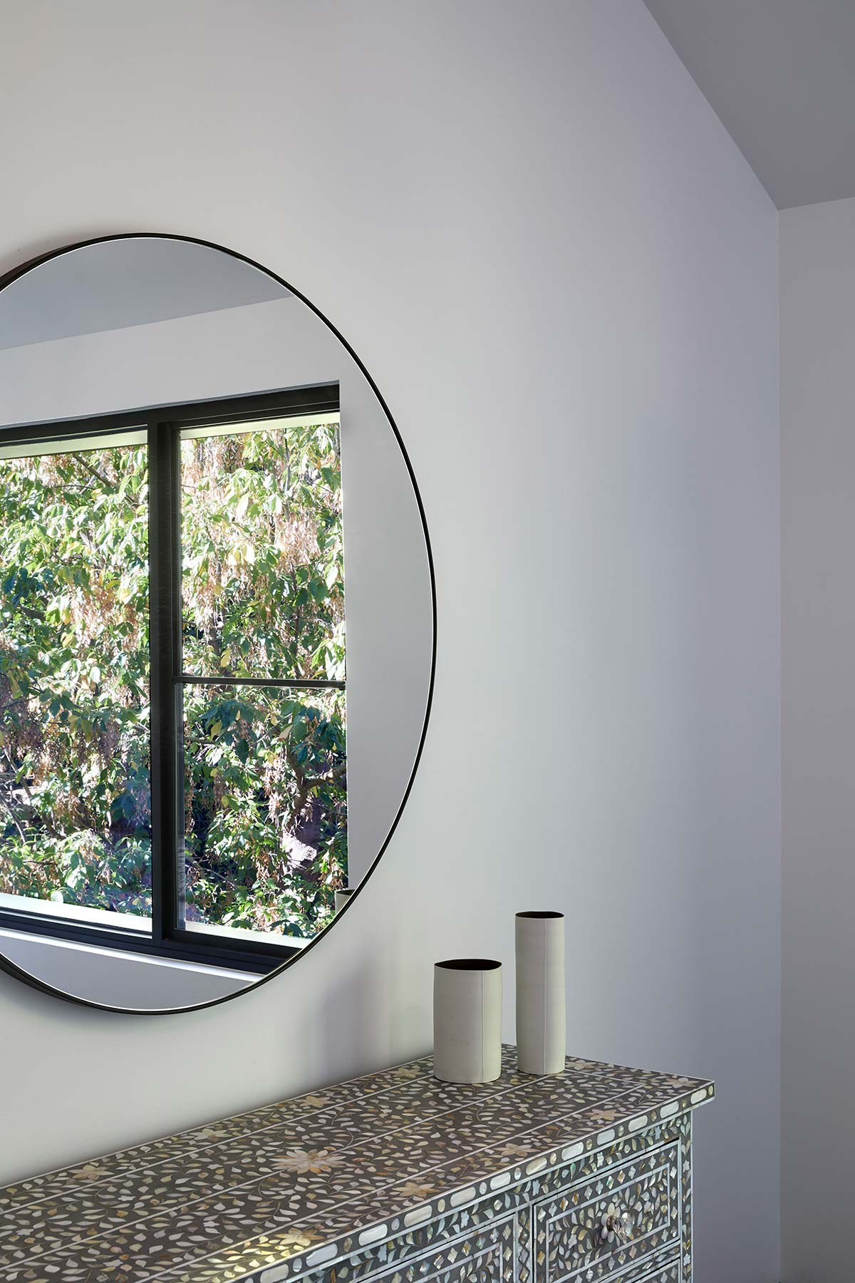 “The existing 1940s house is a red brick post-war structure that had dark introverted spaces. The rear of the house was demolished to make way for informal living, meals area and kitchen that would engage with the surrounding woodland setting. Similarly, the first floor was reconfigured to afford private views into tree canopies and tall hedges from the bedrooms. The pitched roof of the existing house was replicated in the first-floor addition, allowing lofty raked ceilings to the bedrooms.” – Jane Riddell Architects