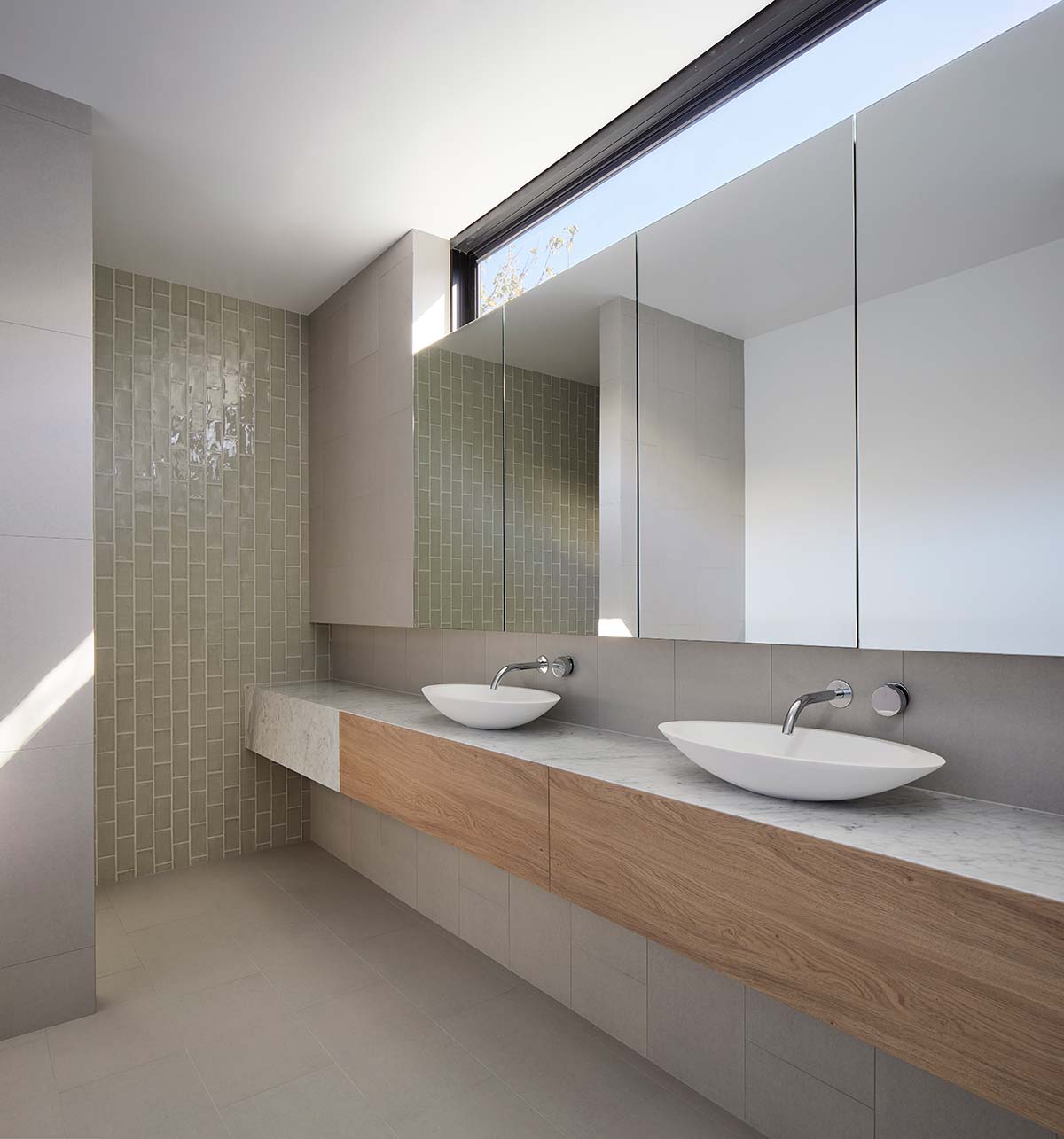 With a modest budget in mind, the team utilized a simple and straightforward design approach to the project. This includes making use of low maintenance and cost-effective materials, such as charred timber cladding which has an almost rough organic feel that worked with the extruded gable form and shrouded windows of the addition. It was also used for both its raven colour and its longevity of the finish. Internally finishes are restrained, with matte and timber laminates used to offset Carrara marble and hand-made tiles.