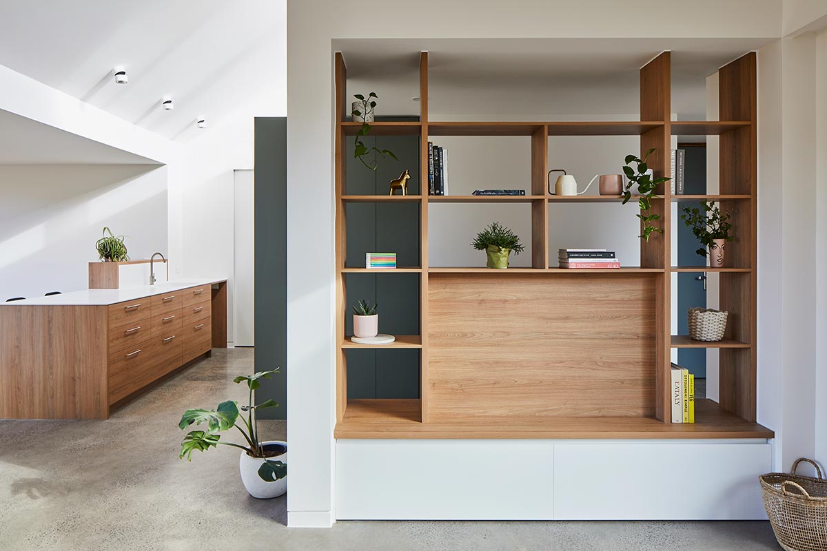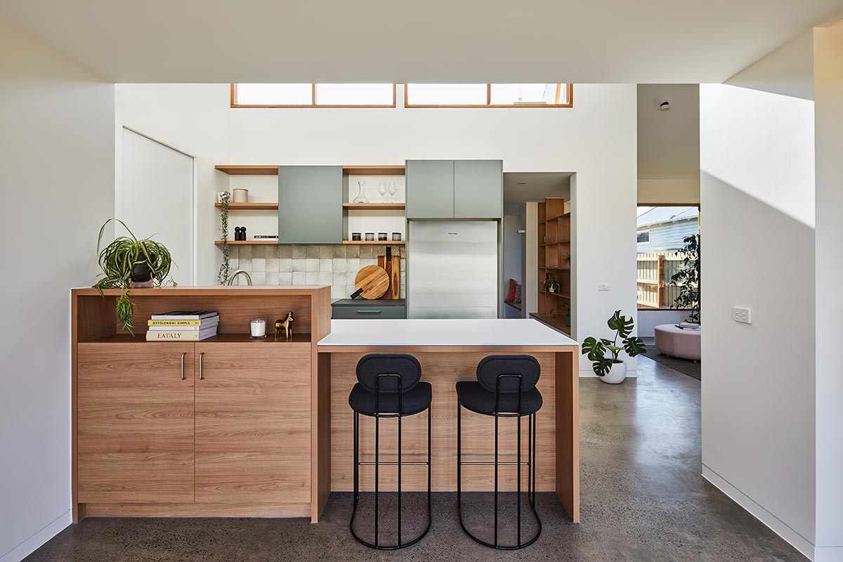 Decked with native Australian hardwoods, Zincalume wall cladding and a paired back internal palette, the chosen materials were not only considered to stand the test of time, but to be healthy and have a minimal environmental impact. The exposed concrete floor beautifully contrasts the warming timber and brass tones that will age with character through time.