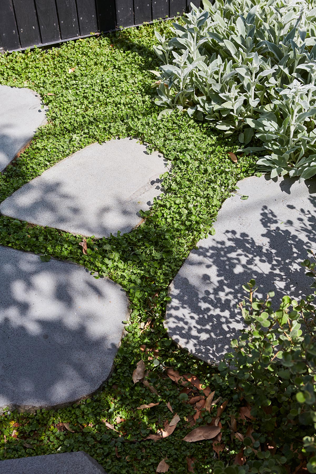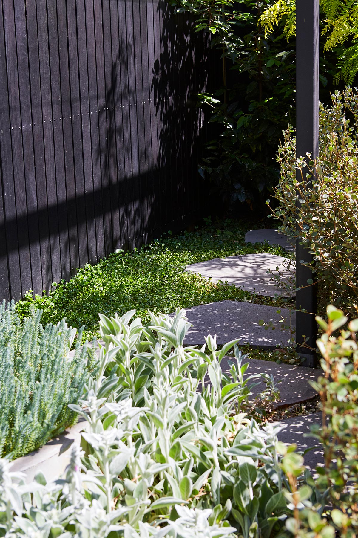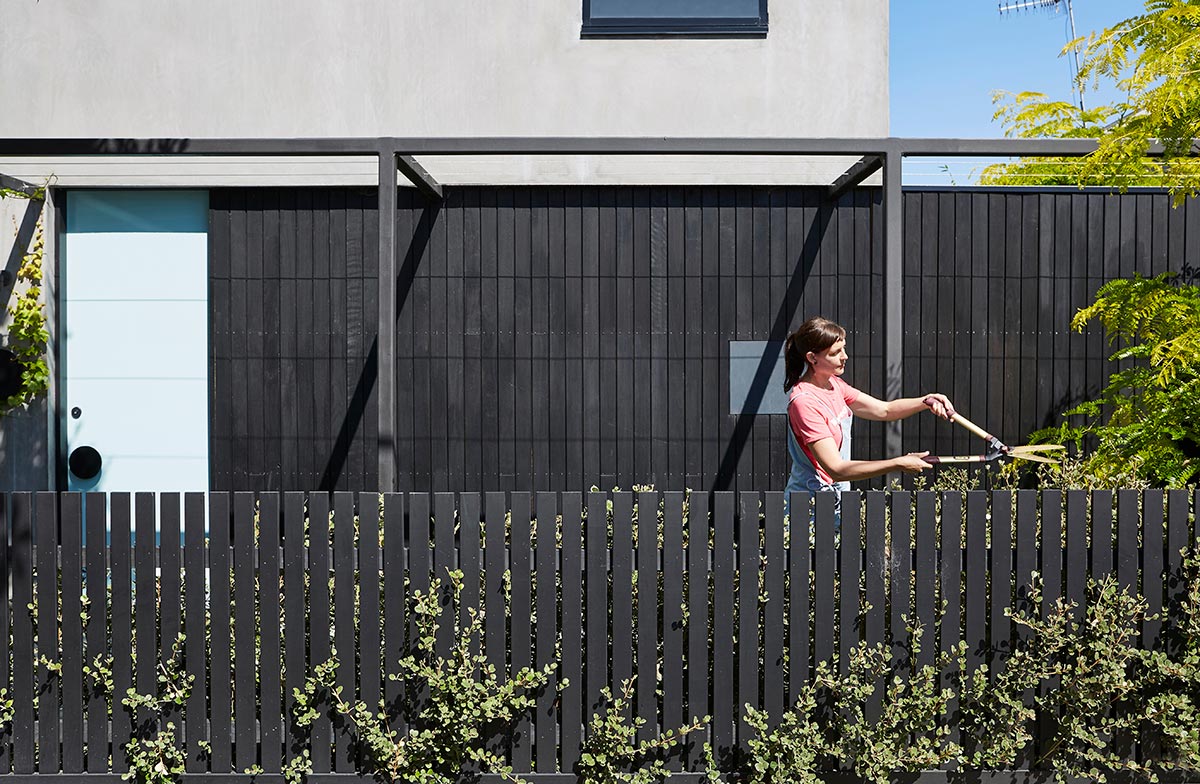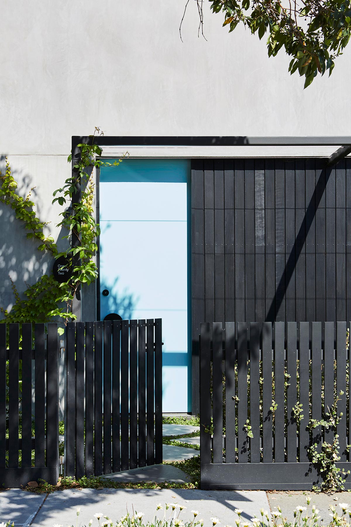 When you’re in Cremorne, Victoria, you’ll know it’s the Chestnut townhouse when you see that modern blue front door and minimalist exterior low black fence. Plants peak through the spaces in between the low thin planks and greet those who enter the home along the lush grassy stone step path.