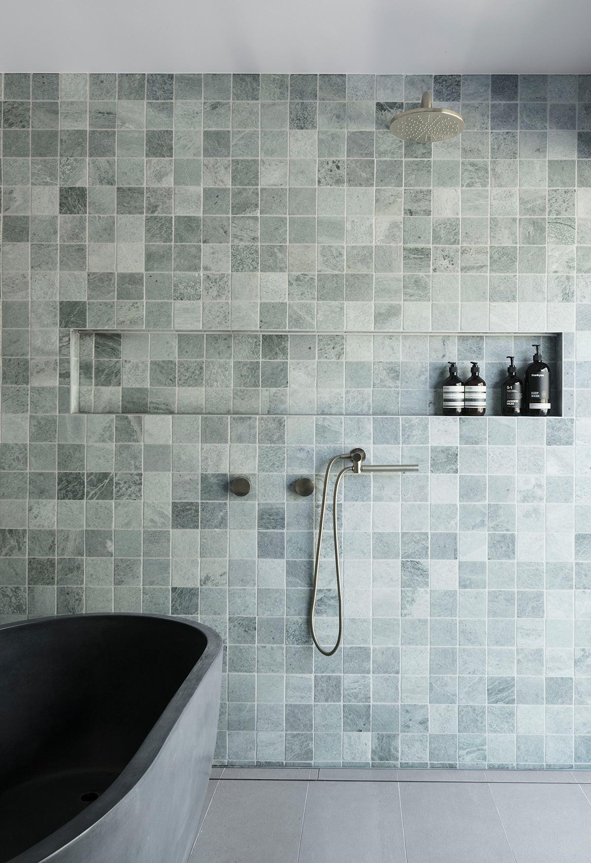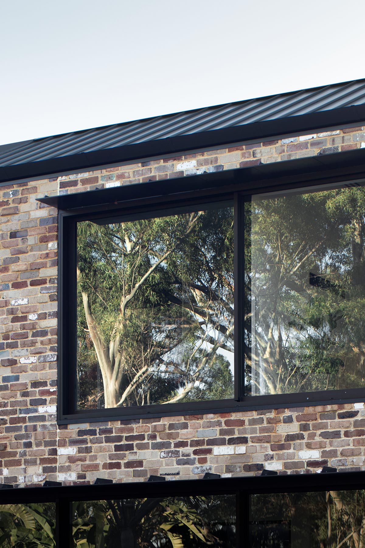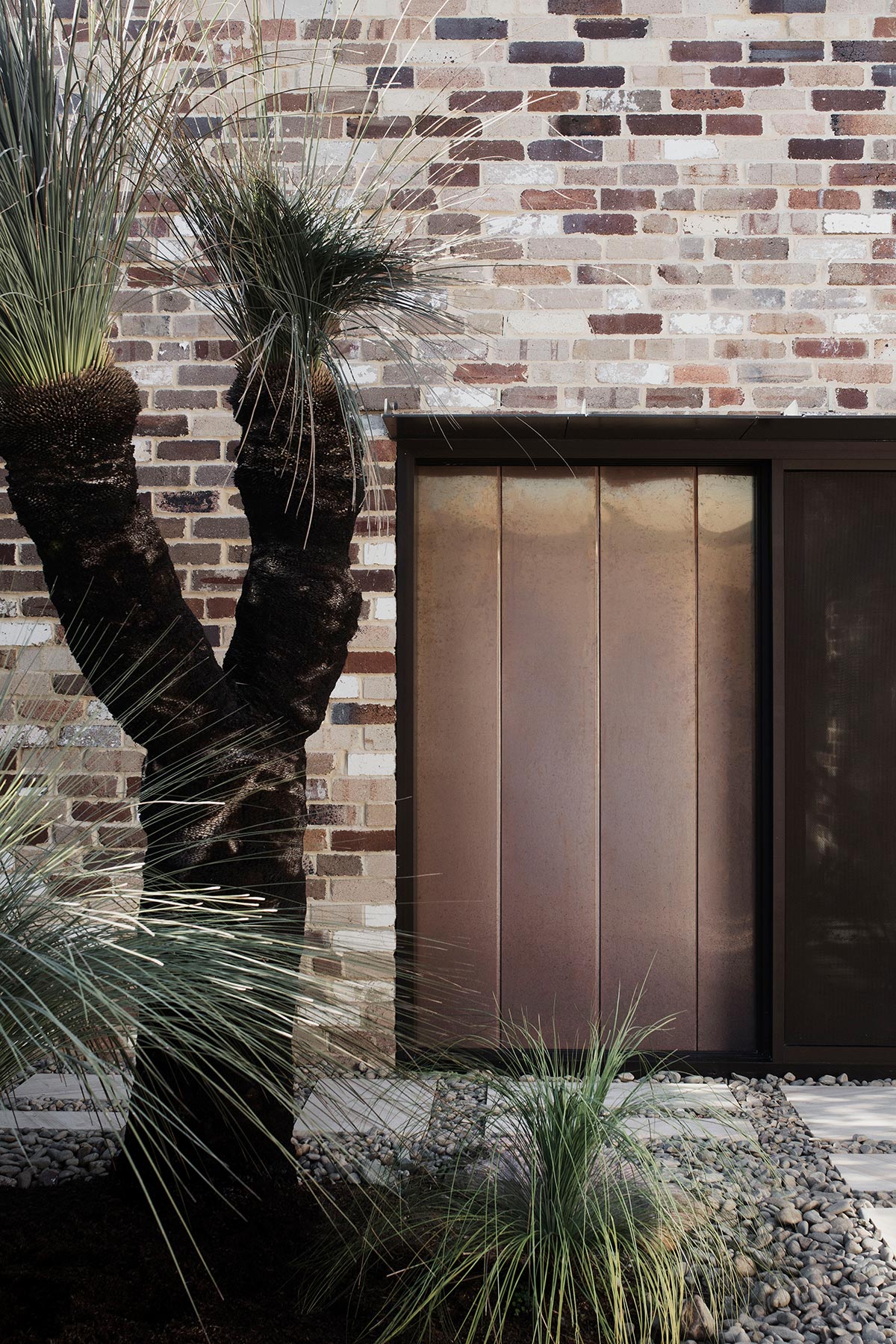 “Materially, the recycled brick honours the fabric of the existing cottage whilst adding robustness and patina to complement the rugged terrain of the lake reserve. Steel and copper accents set up the house for graceful weathering. Inside, a softer palette of timber, stone and fabric combined with a paint palette of eucalyptus greens create a vibrant, light domestic interior and bring a sense of the landscape within, a composition to complement the framed views.” – Youssofzay + Hart