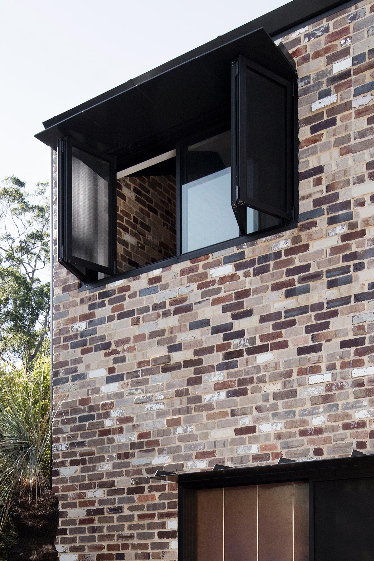 “Sustainable design principles were incorporated throughout the design to minimise energy use and modulate extreme Sydney temperature fluctuations. The new addition abuts the old house defining a north-facing courtyard and orienting living spaces toward sunlight and greenery. Projecting plate steel sunshades shelter the glass from summer sun whilst perforated aluminium operable screens protect glass from the low-angled sun in the late afternoon.” – Youssofzay + Hart