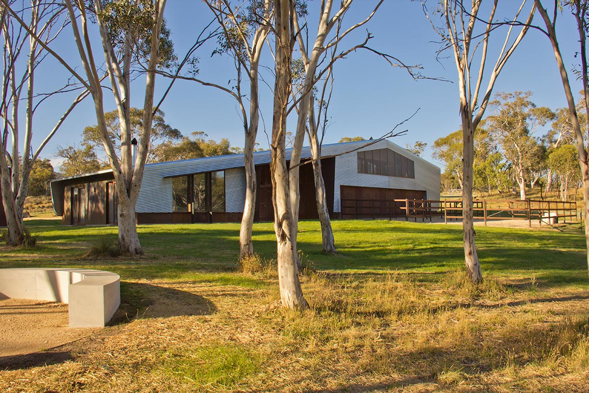 “A large portal through the stables frames the view to the landscape beyond, and provides a practical space for preparing for a horse ride, unpacking a car, storing firewood, as well as a dry entry to the building. The silvery form of the stables is clad in corrugated iron, which wraps in a continuous surface up the walls of the building, and over the roof. The alignment of the corrugations is parallel to the roof pitch, emphasising the trapezoidal form.” – Casey Brown Architecture