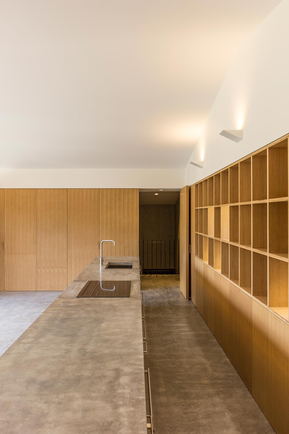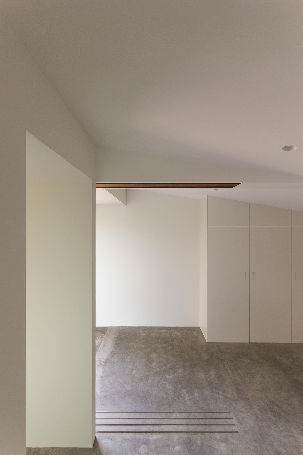 Breaking the wall plane, providing natural light and cross ventilation, small pivoting windows that puncture the facade can be found on the southern edge of the building. On the northern façade, large windows admit light and warmth. Allowing for panoramic views out to the mountain range is a large trapezoidal opening to the upstairs recessed verandah.