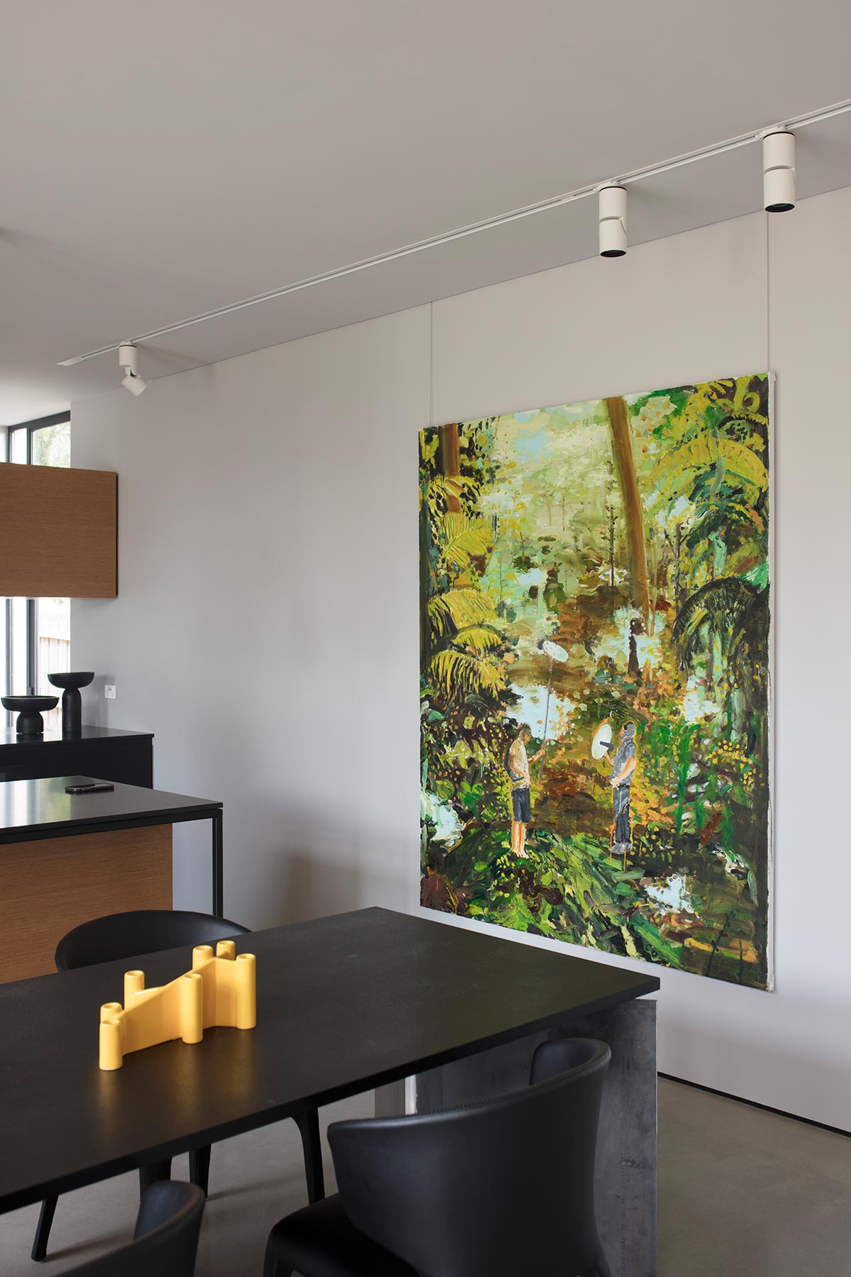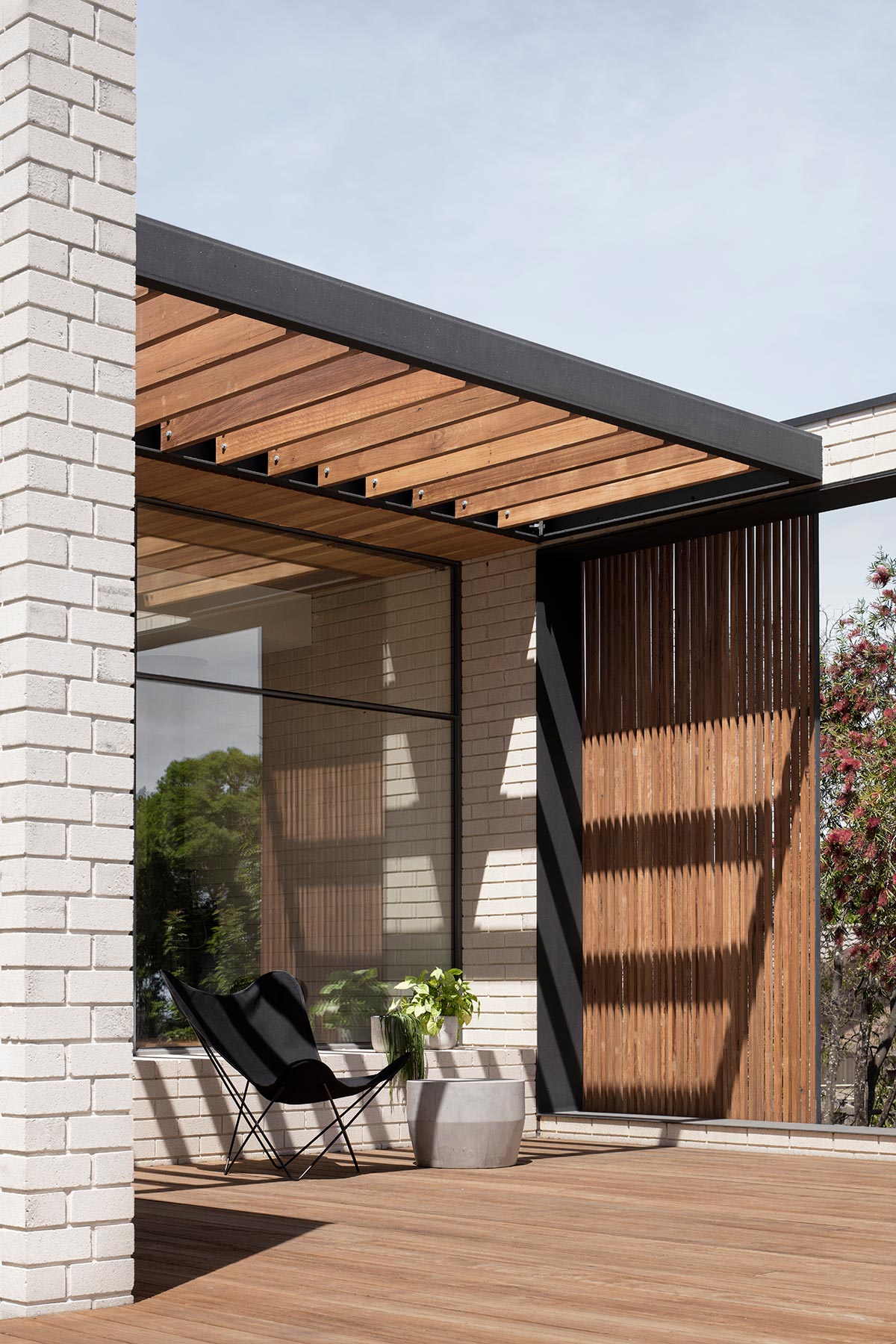 “This approach extends to the south facade of the original structure where a poorly built 1990’s extension was demolished. Large black steel-framed openings mark the location of the previous renovations – creating a covered outdoor dining space within the original home. This design gesture not only helps to record the history of the site, but it also helps connect the original structure to the landscape and frame views of the surrounding ‘churchscape’.” – Moloney Architects