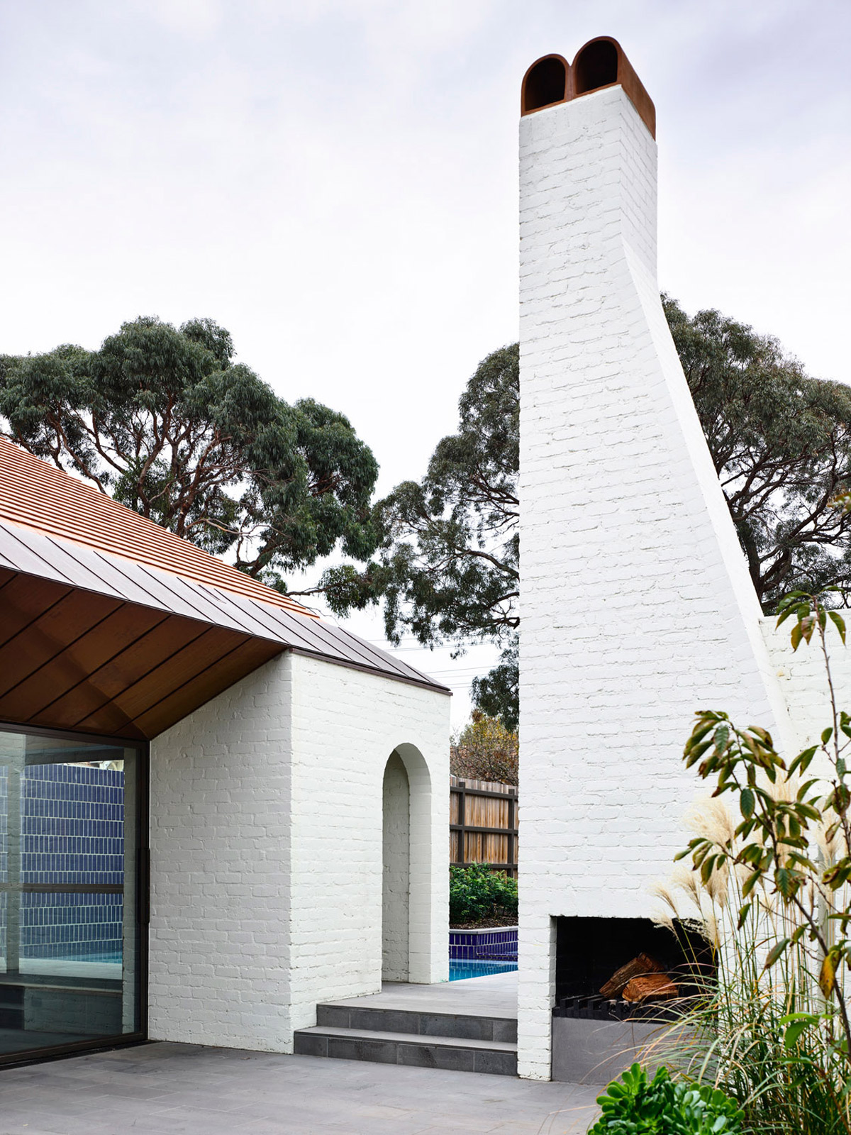 In a neighbourhood described by Kennedy Nolan as “roofs and chimneys emerging from lush tree canopies”, they were conscious of the neighbours who were very attached to the Edwardian character of the street. Deepdene House draws on Arts and Crafts architecture – a style that overlapped with the Edwardian era – through its combination of crafted materials and decorative forms. White painted brickwork, a patterned semi-transparent wall and a swimming pool lined with vibrant blue tiles help create this aesthetic.