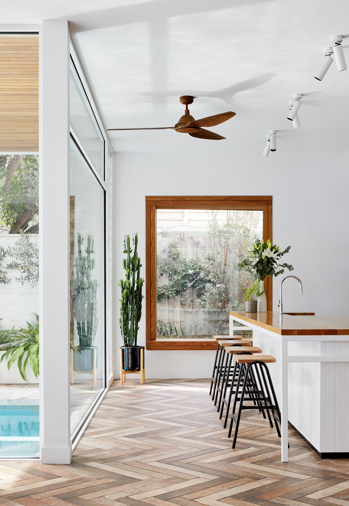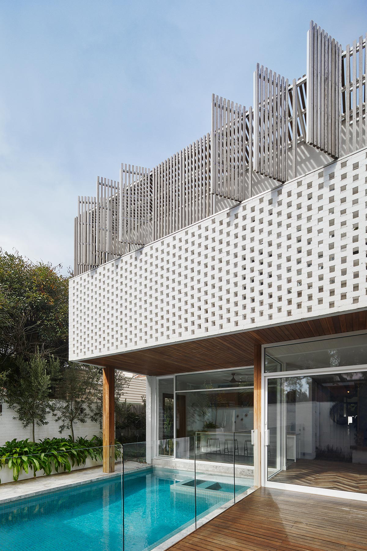 Among the features of this self-contained backyard are a pool and deck, an outdoor shower, a BBQ station, a secondary dining area, and a garden area. The pool is near the windows in the kitchen and living room, thus creating a longer picture and minimising the need for pool fencing.
