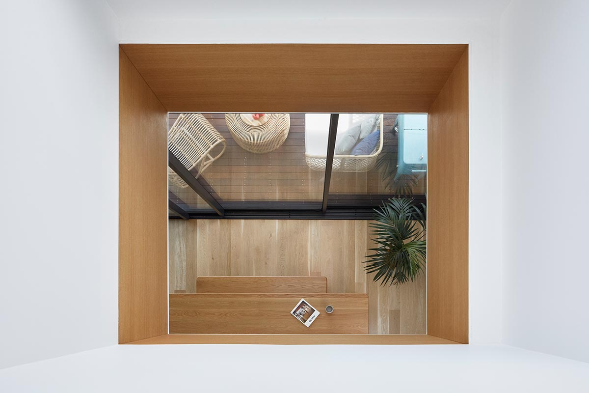 A strong linear design can be seen in the interior elements such as the staircase and joinery to conform to the plan of the house, which gives a smooth flow of space and a sense of consistency in detail and scale.