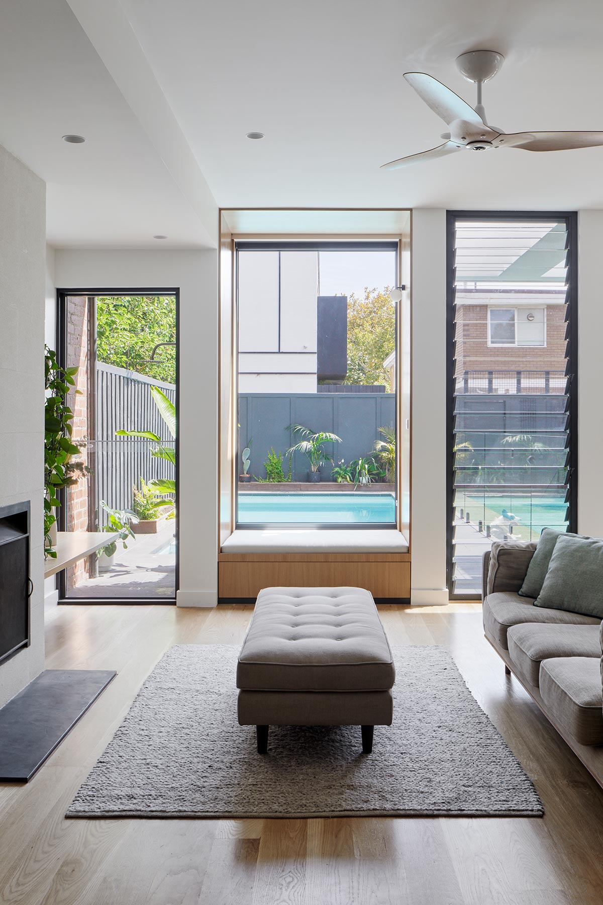 The existing garage floor area was reduced to provide more usable open space in the backyard, as well as an undercover BBQ area and the reconstruction of the deck and pergola area. The pool can be seen clearly from the living room and upstairs spaces.