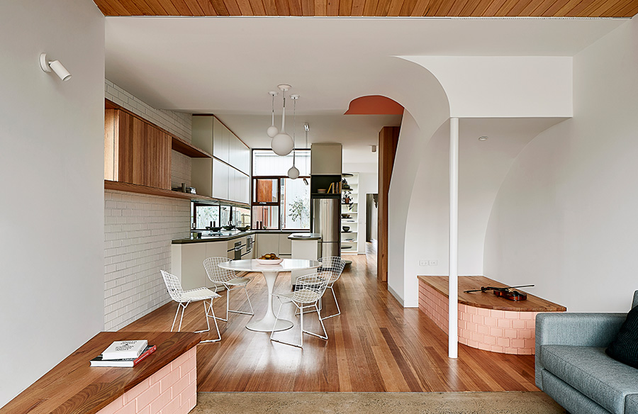 A new curved timber wall at the end of the hallway both works as a link between old and new and a barrier to the street. It leads into the kitchen planned to greet visitors at arrival and overlooking the courtyard and study. The extension is split up with a courtyard for sunlight into the old house, and natural light and cross ventilation into the new. The hall linking terrace with extension was widened for a study with outdoor access.