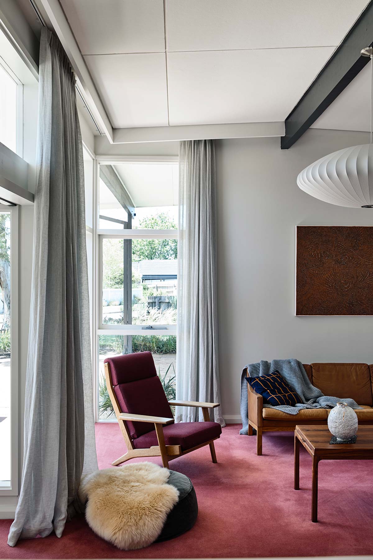 “Overall there was only a minor increase in floor area. An ensuite has been added to the main bedroom and the south wall of the bedrooms was pushed out the line of the original eave. We lifted the roof to provide greater ceiling heights than the original 2.2m low point in the bedrooms. Also added an outdoor living terrace to the north with a pergola over. Almost every surface has been updated, replaced or re-finished in some way from the roofing to the entry tiles to replacing the ceiling while retaining the expressed joint between ceiling panels.” – MRTN Architects