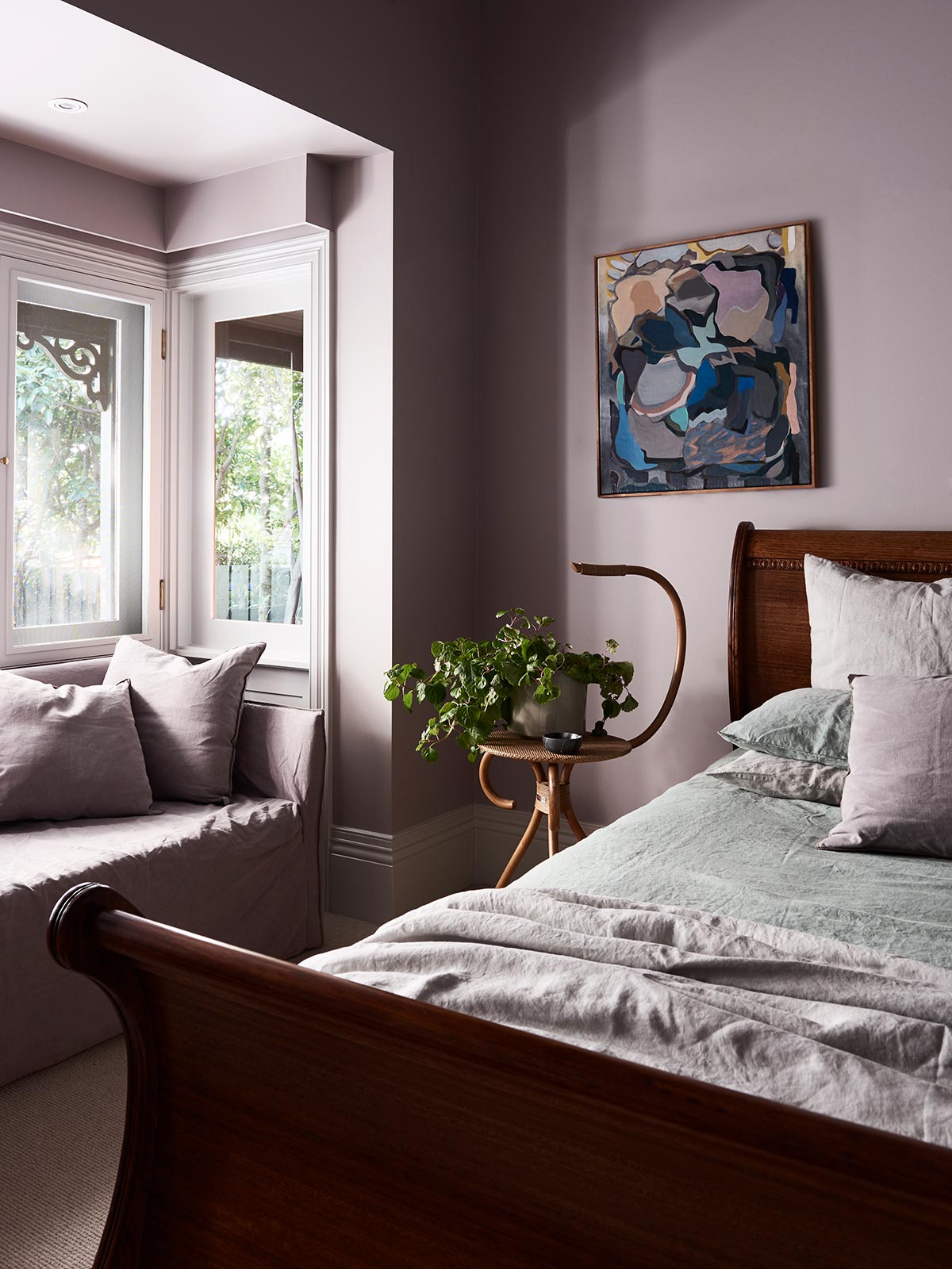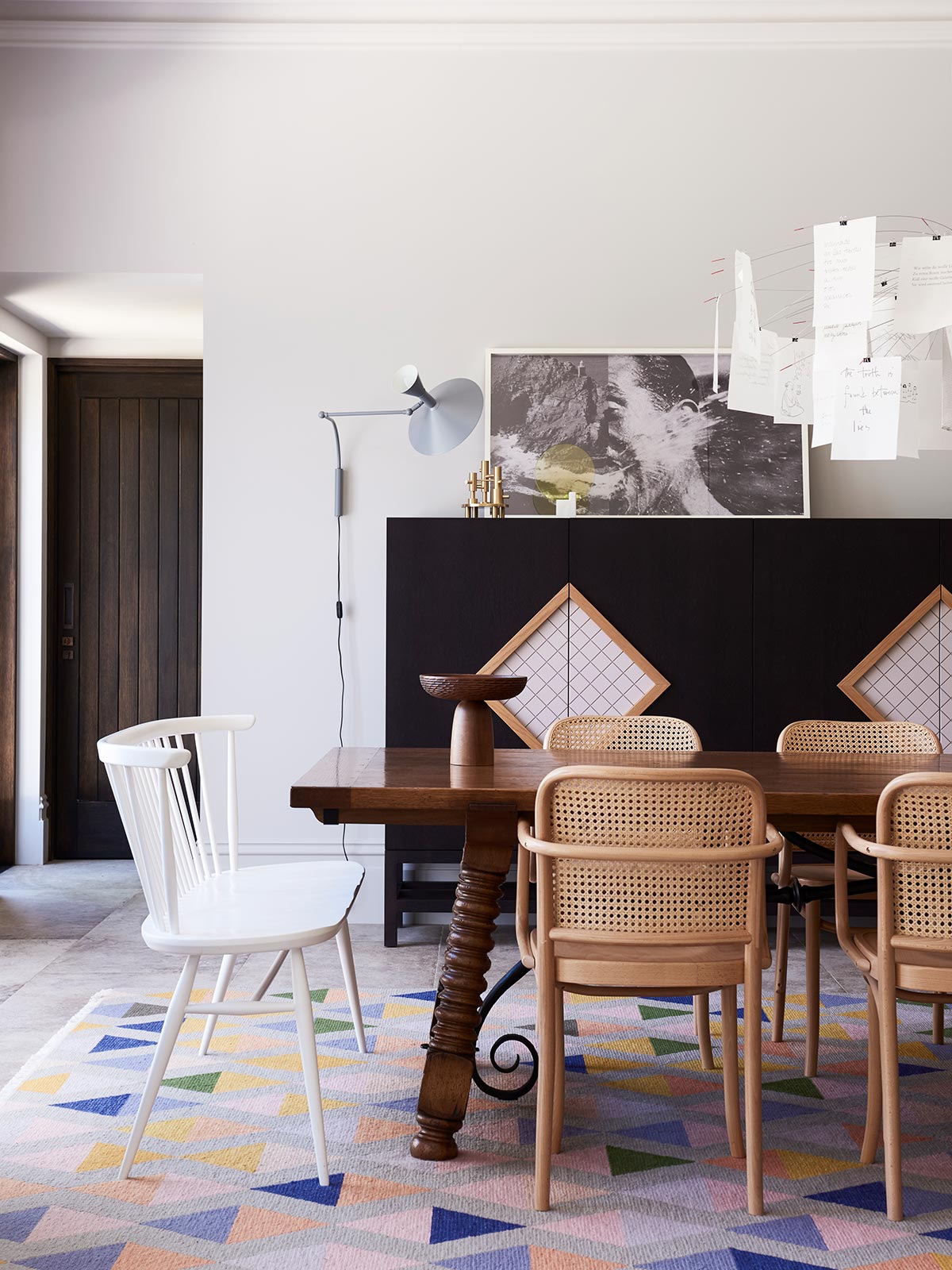 “The rose and forest green colour palette was directly inspired by the existing stained-glass windows and is consistently used throughout the home, beginning in the front rooms, reintroduced through the kitchen, and finally in joinery surrounding entry to the snug study. Decorative lighting became a major component in establishing mood and whimsy, while the use of colour provides elements of romance and wonder throughout the interior.” – Chelsea Hing Interior Design