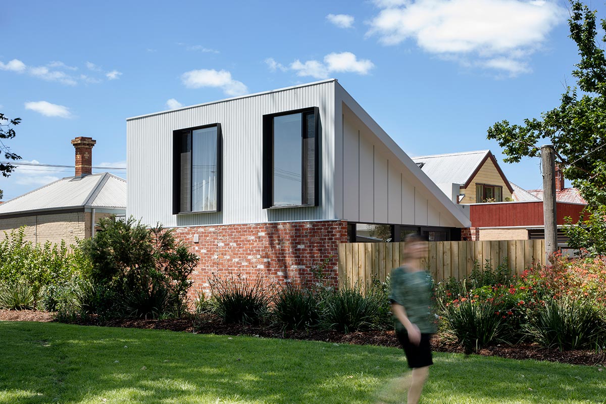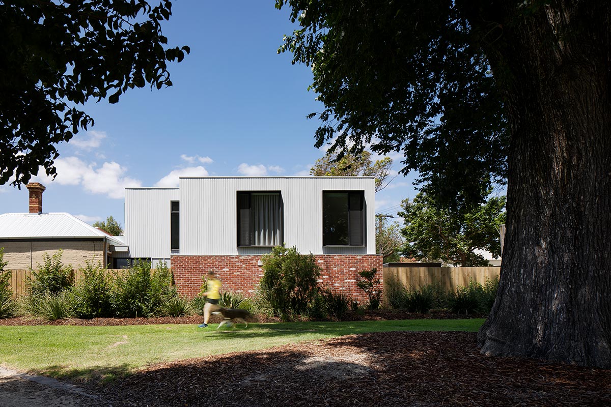 Designed to contrast with the retained house, the new addition showcases a rich, red brick wall through the park boundary that serves as a base to the wood adorned pale grey first floor. The main aspect was to invite more natural light inside the home and to display the beautiful view of the adjacent park while giving way to more usable outdoor space directly connected to the house’s interior. The front section of the house where the bedrooms and the chimney are located were retained in lieu of the existing heritage overlays. Meanwhile, new additions include the master bedroom, ensuite and study located on the first floor, and an open concept living / dining / kitchen, a bathroom and laundry located on the ground floor.