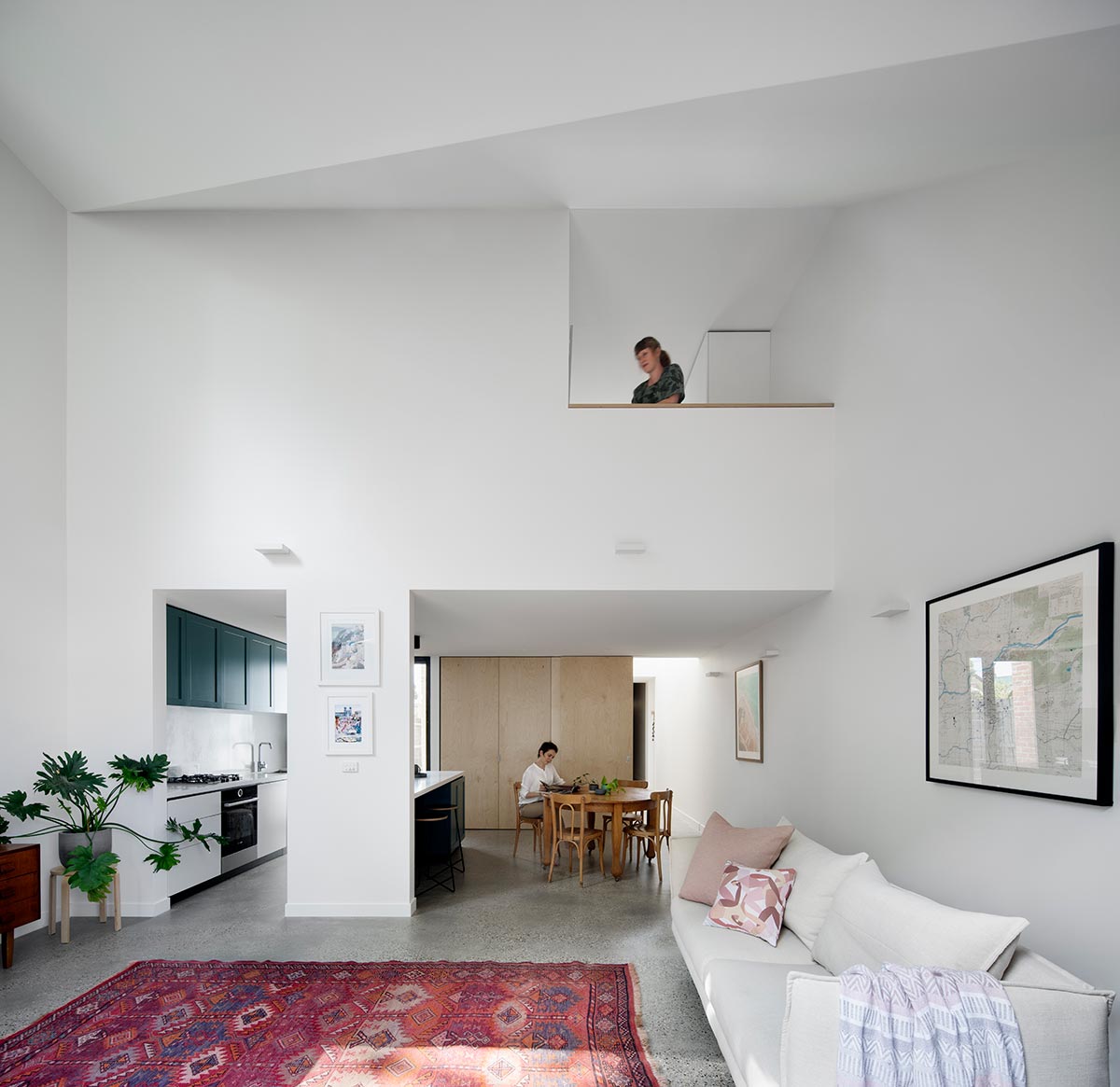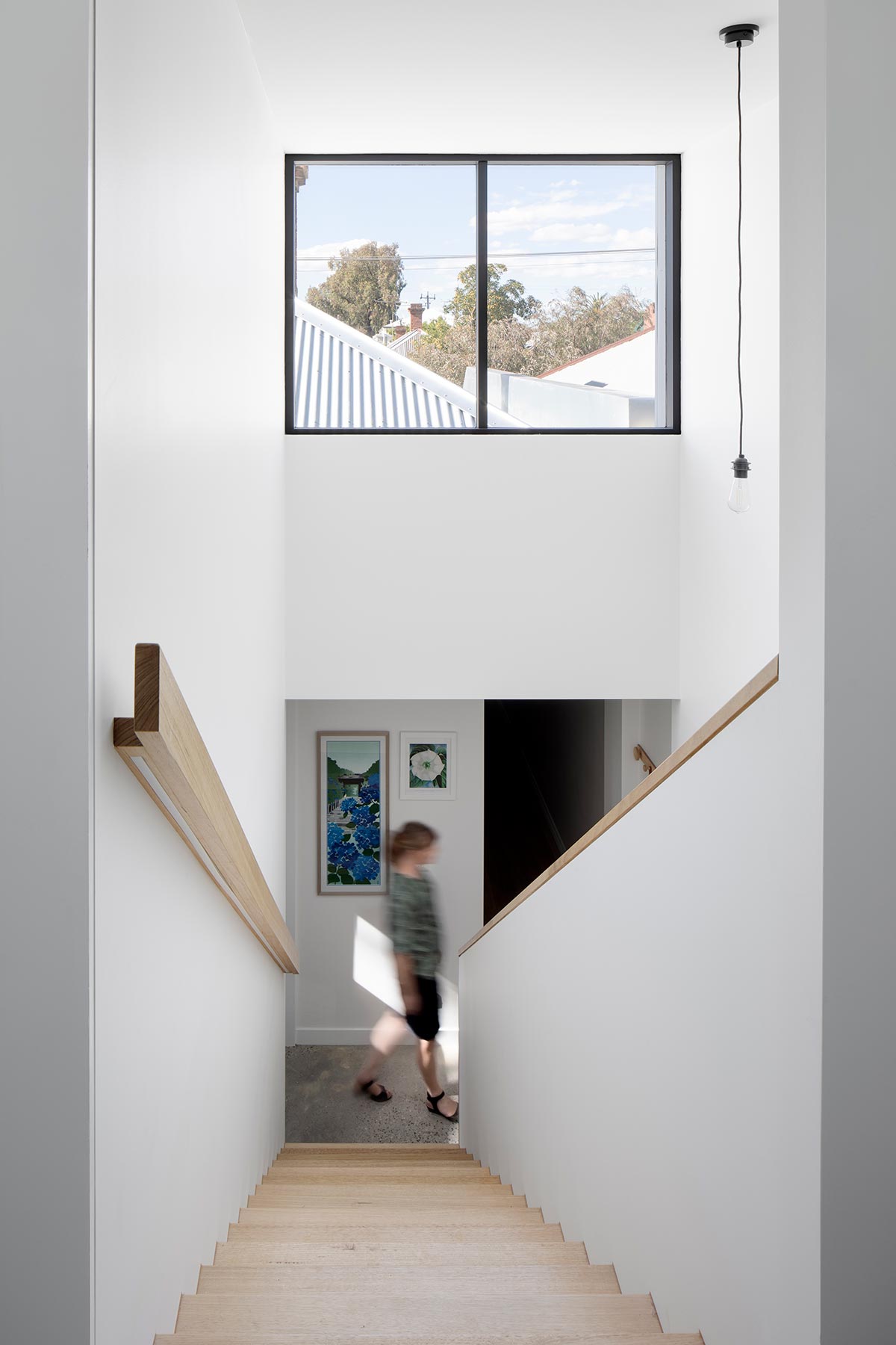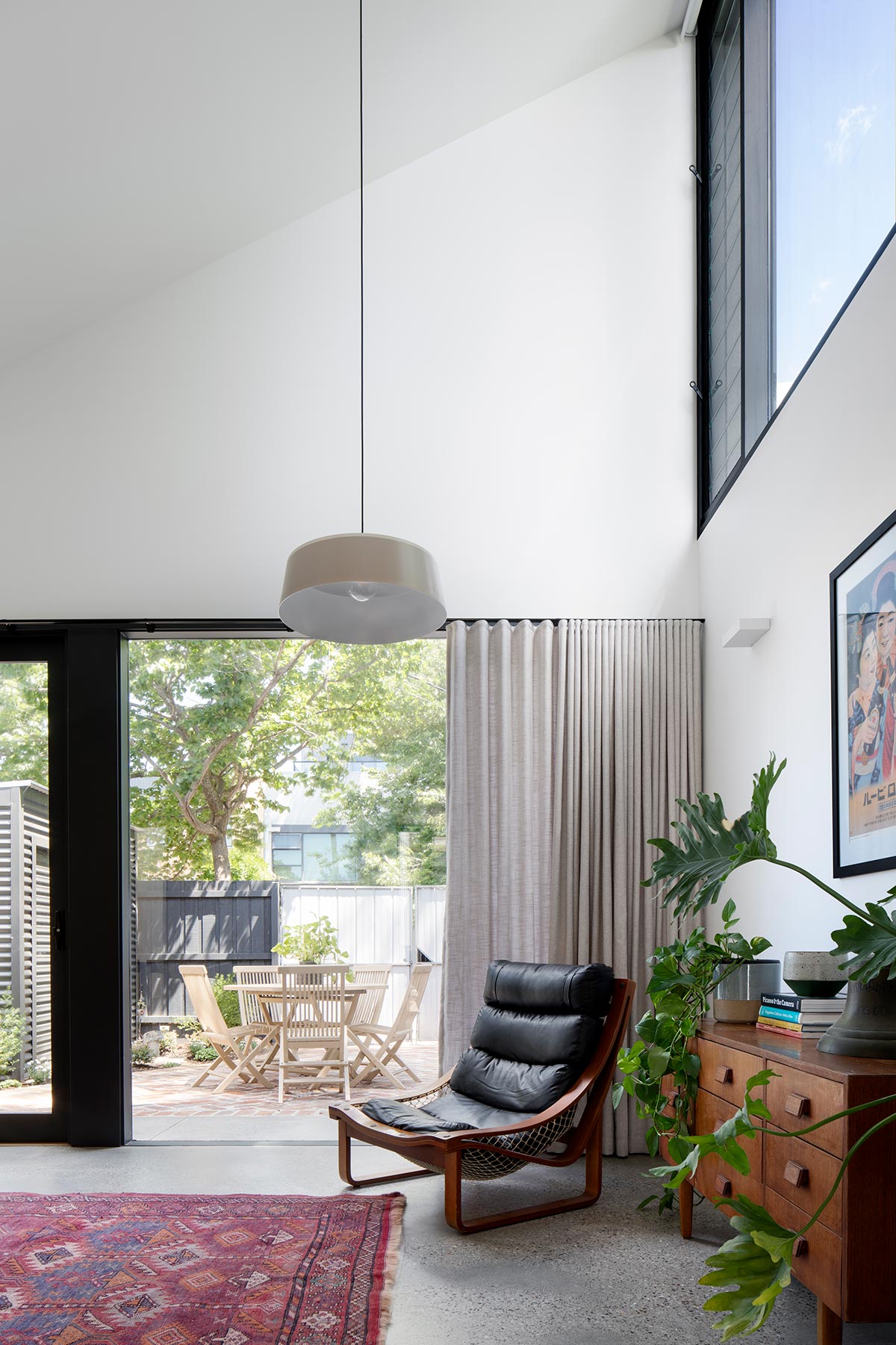 “Windows at high level capture views of the surrounding roofscapes and frame typical Brunswick views, beloved by the owner and architect alike. The adjacent park becomes a part of the house with views of the mature trees captured along the park side of the house. At ground level, wide glazed siding doors and full width windows connect the interior directly to the rear garden and new deck, making the relatively small spaces feel much larger.“ – Sarah Kahn Architect