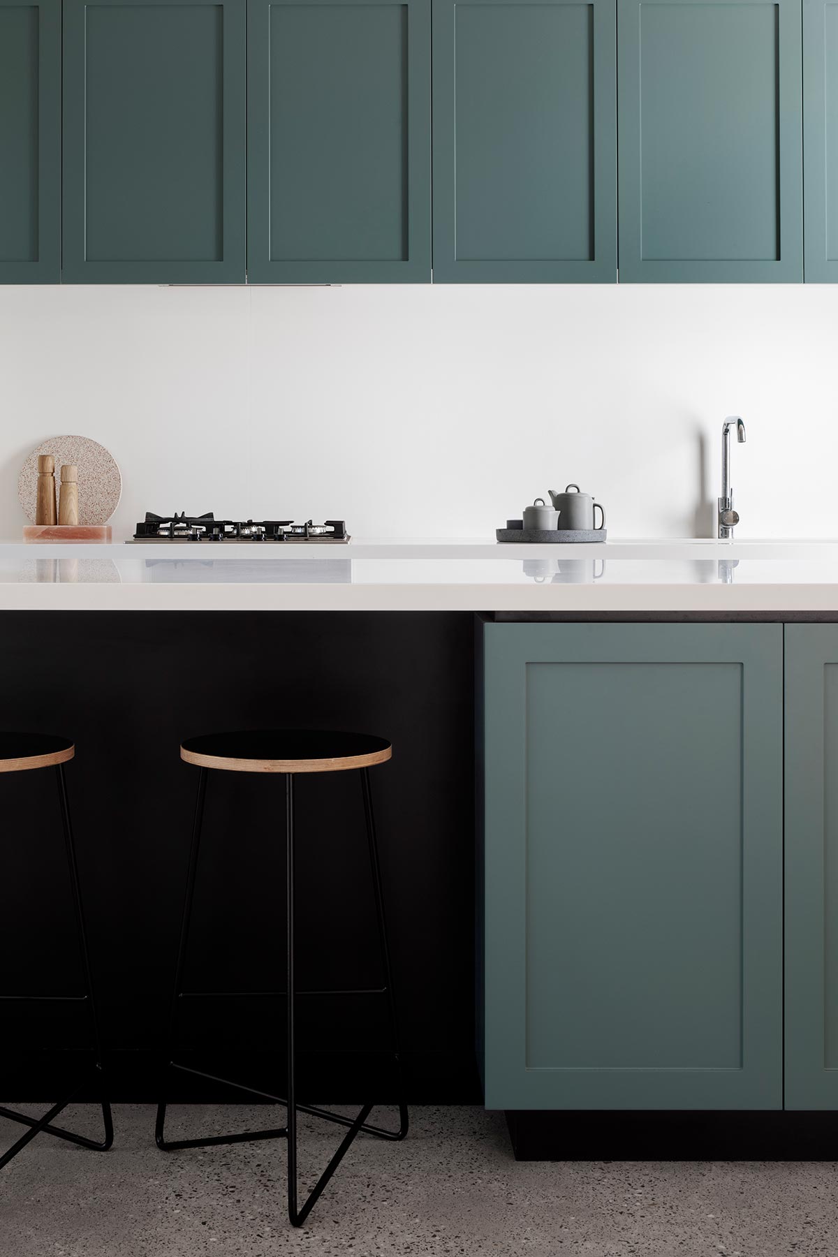 On the inside, finishes are simple and practical. Interiors painted all throughout to maintain the feeling of having a wide space and brightness comparative to the small rooms. Spawning a simple background for the owner’s diverse furniture and art collection, natural colored plywood and dim colored window frames create contrast with the white. In the kitchen, a spruce of teal, the owner’s favorite shade is added alongside black, white and plywood.
