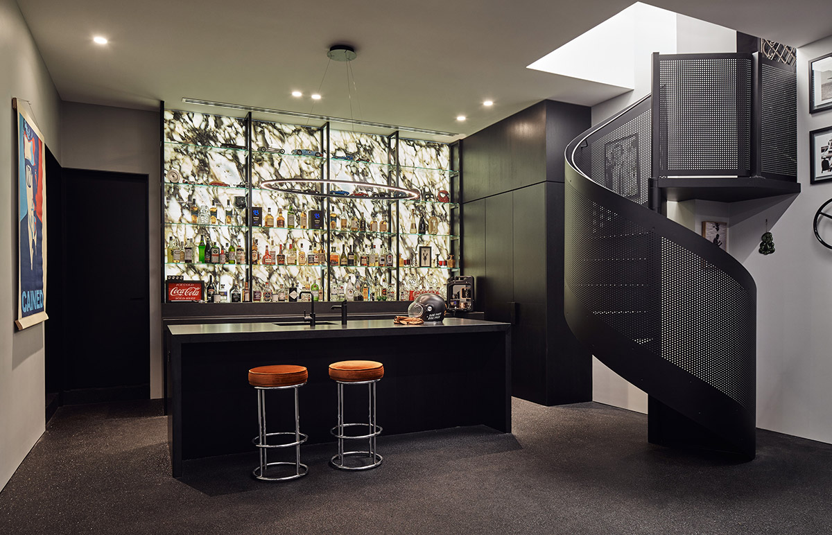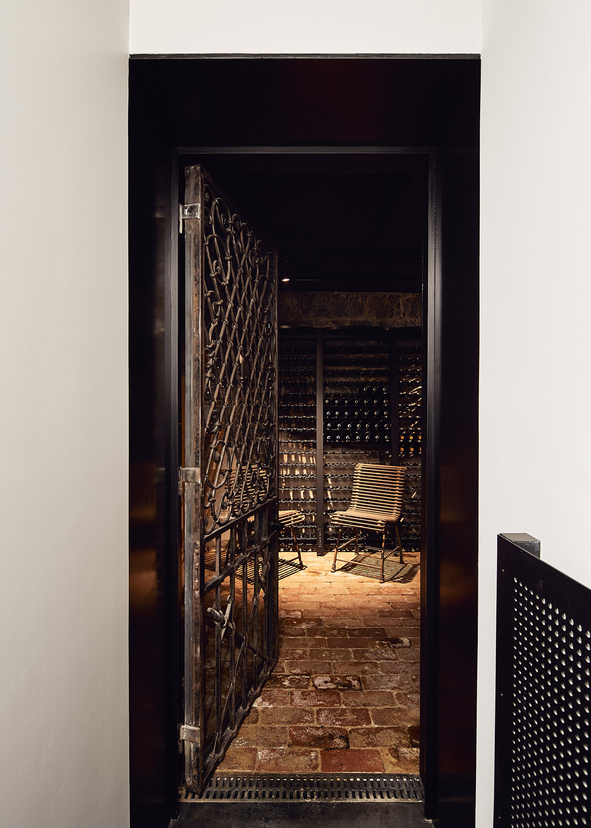 Extending directly under the old house, the existing wine cellar connects with a basement suitable to house eight cars, a car wash, a modern bar, and an entertainment space for social gatherings.