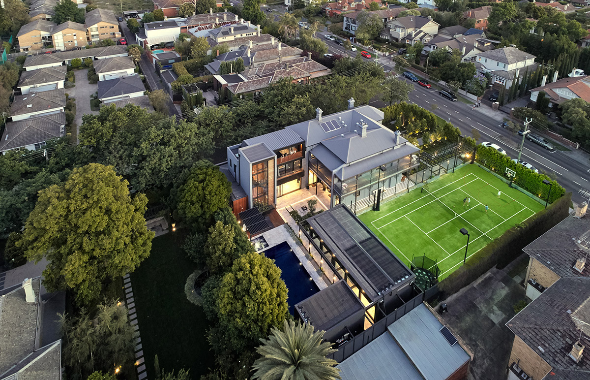 The frontage was kept to honour its historical significance, while the existing back extension, built in the nineties was renovated with a scope of predominantly contemporary design and materials. Featuring a garden house, gym, pool, pavilion, and tennis court; this collection of spaces are linked through access and aesthetic design.