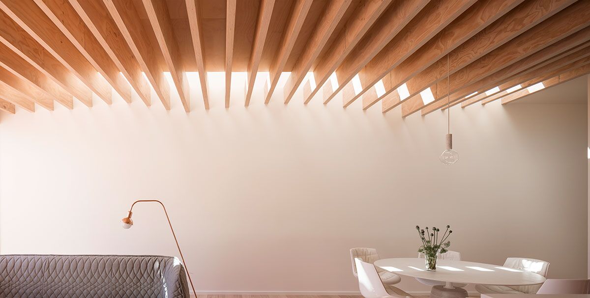 The overall experience of the house is of the tracks of sunlight and shadow moving across the space. A carefully considered full-length skylight on the north edge of the space brings in abundant light, which is filtered and diffused by the exposed rafters, changing through the course of the day, and amplified by the varying depths of the rafters.