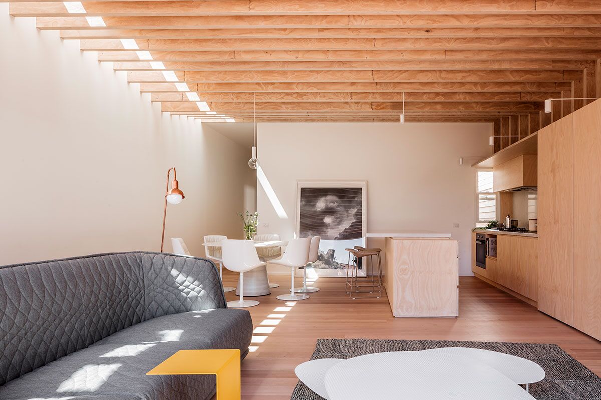 The structure and cladding of the extension is almost entirely built of laminated hoop pine. The use of a singular material acts as a unifying texture, defining the experience of the new space. Timber features are prominent in the interior, helping to create a warm, contemporary atmosphere. Carefully picked minimalistic furniture and decor compliment the space perfectly, whilst the use of a neutral colour palette effortlessly pulls it all together.