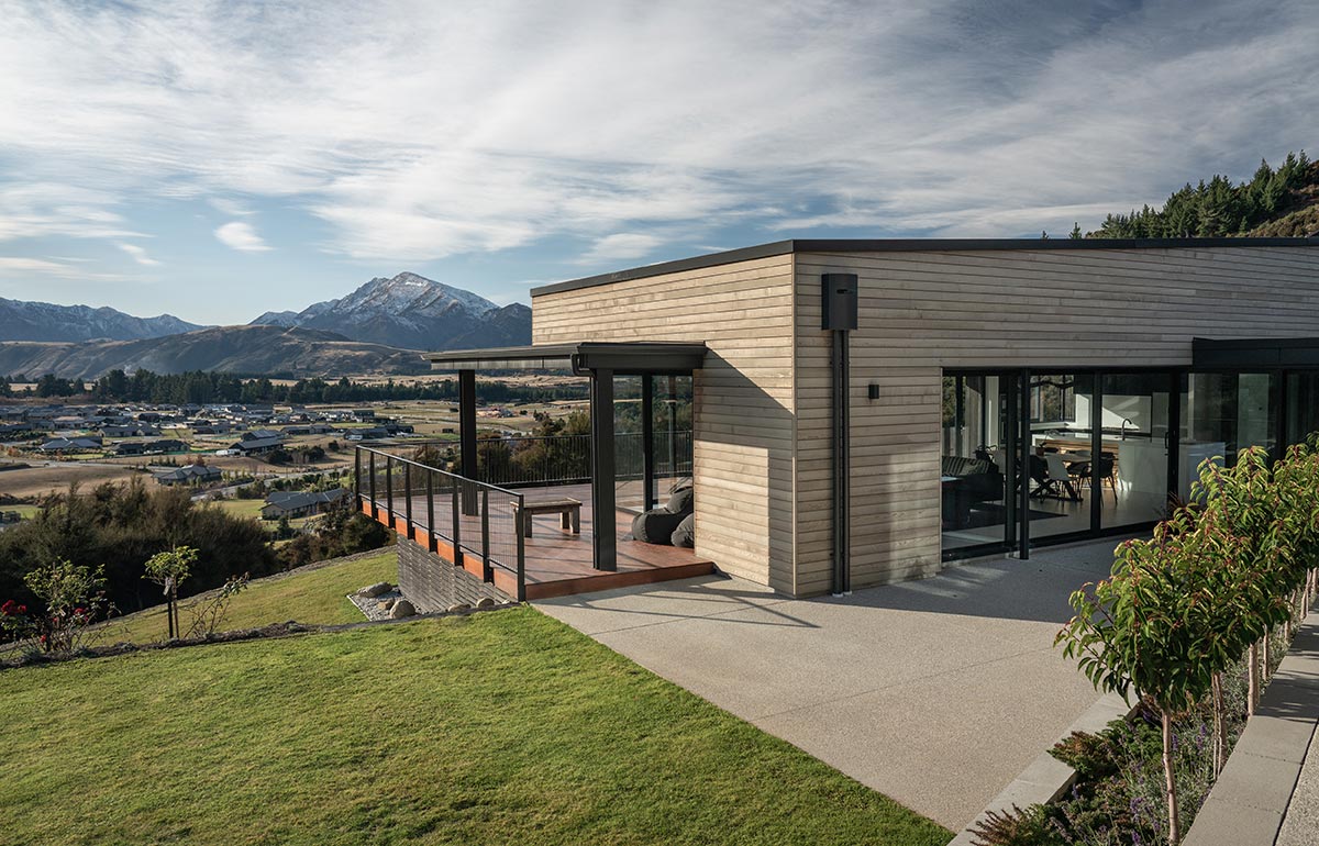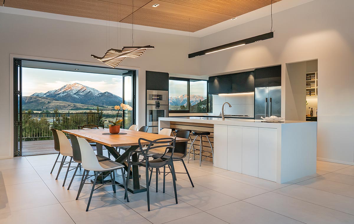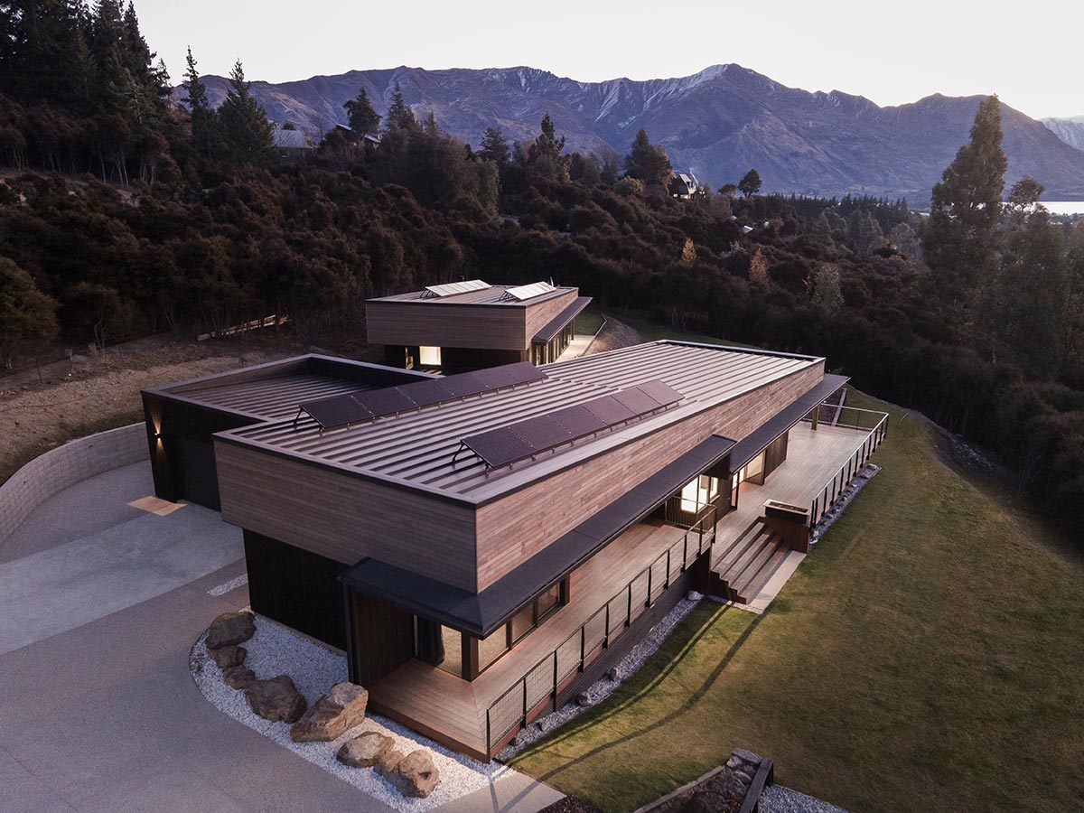 A rugged backdrop of kanuka forms a striking contrast with the modern structure, creating a beautiful disparity between the two but ultimately complementing it as well. Made up of two striking wedge forms, the structure steps down a sloped site, with an open-plan living, kitchen and dining room located in the main wing, where generous floor-to-ceiling glazing allows for picturesque views of the mountains and lake beyond.
