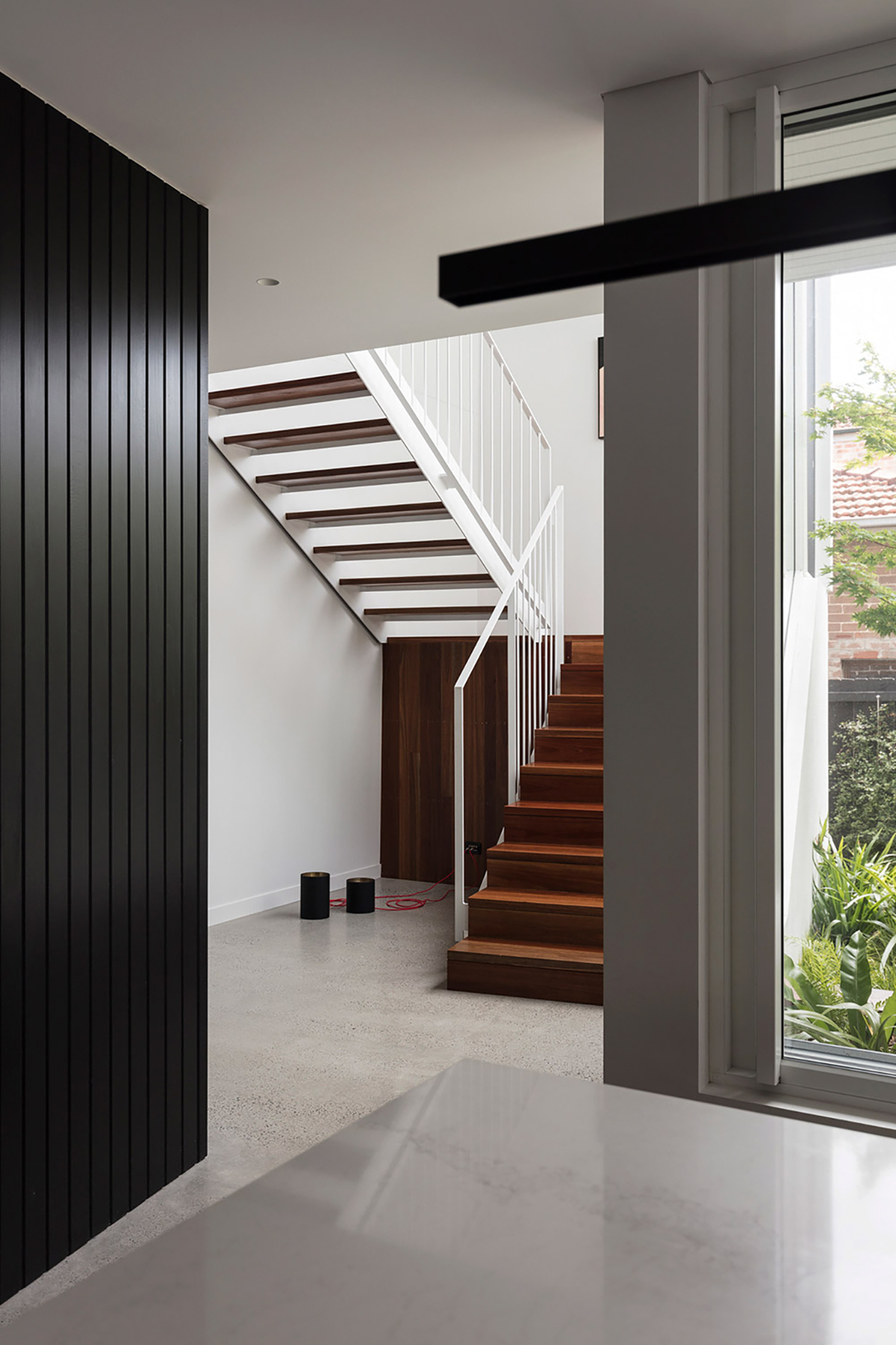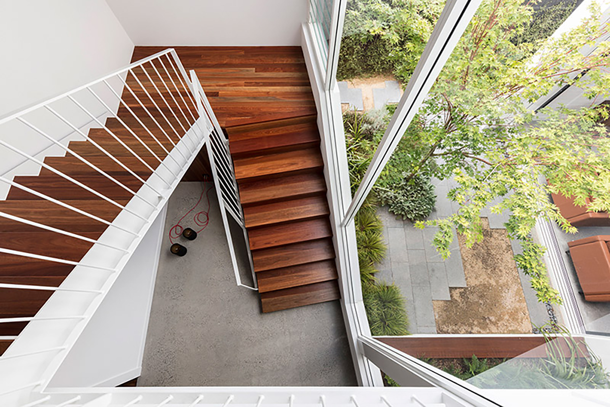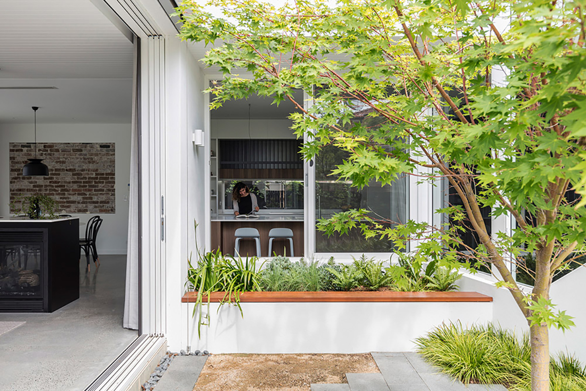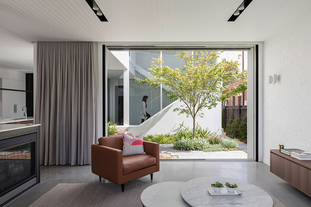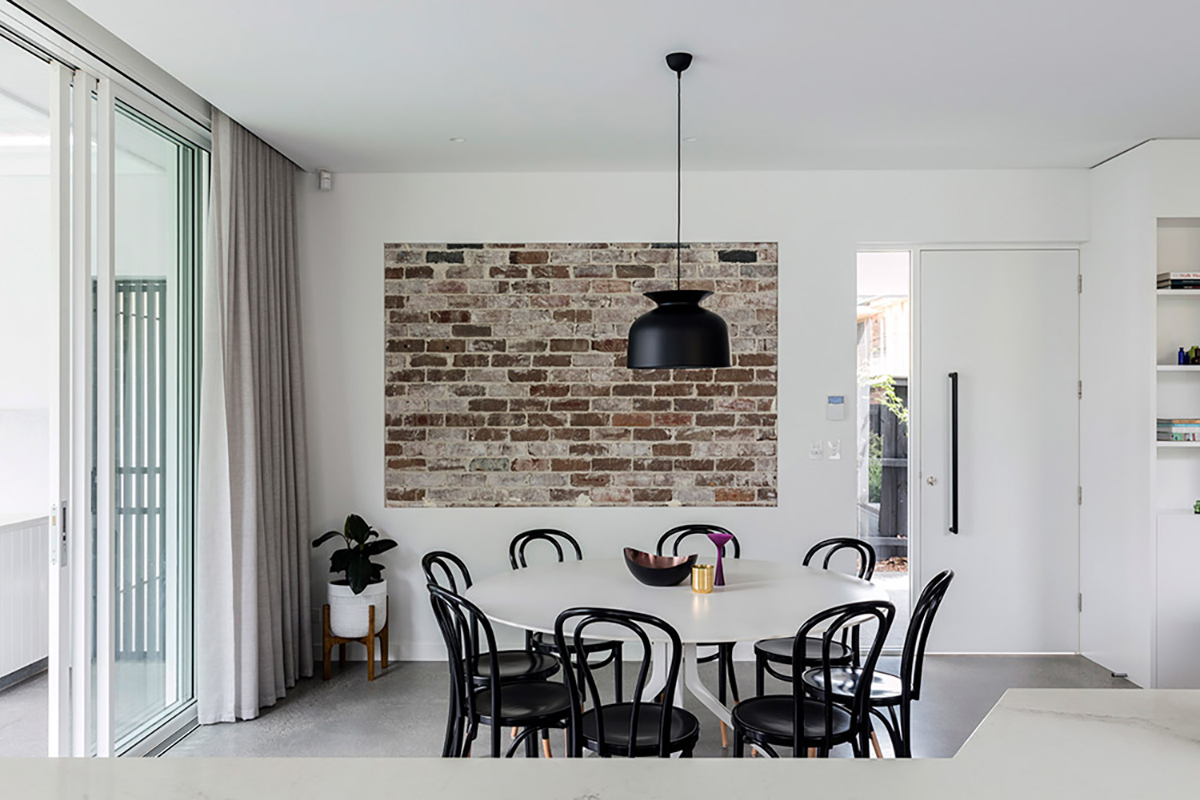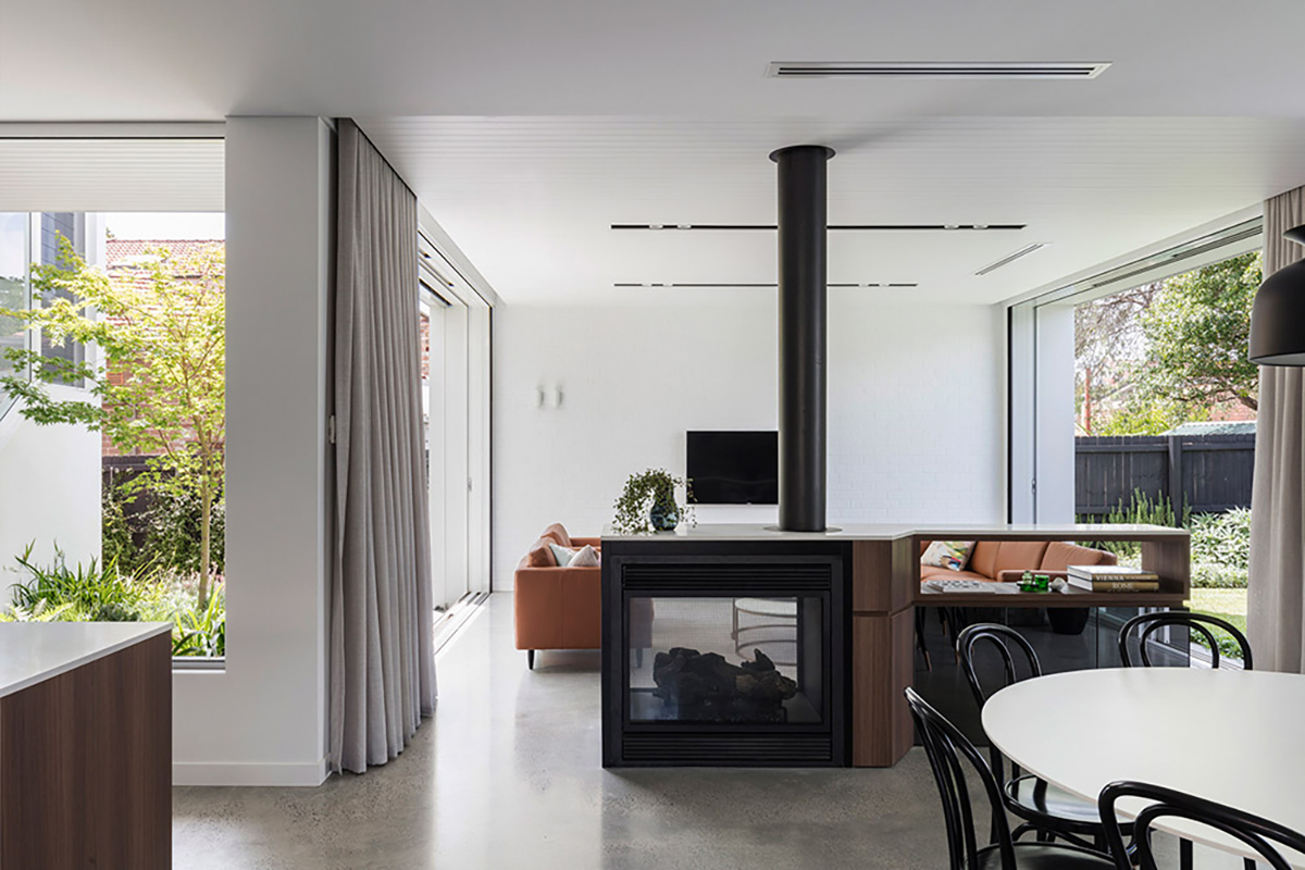 From a traditional street facade, the house swiftly shifts to a contrasting contemporary, open-plan living space at the back. The idea was to create a central courtyard that will allow more natural light into the living area and also provide a new point that shifts between the old and the new.Mark Szczerbicki Design Studio clearly paid attention to light and who the layout can exist to allow generous amounts of natural light to spread throughout home, creating a more energy efficient household. Despite the emphasis on energy efficiency and material sustainability, much of these preferences remain subtle. This can be seen with the ground floor’s extension work that is made from recycled brickwork from the demolished parts of the existing house. Interior heating on the other hand is well taken care of by the thermal mass of the polished concrete slab and the double-sided fireplace, centrally located to equally warm up surrounding spaces.