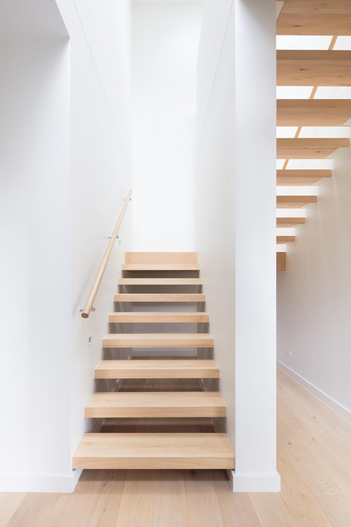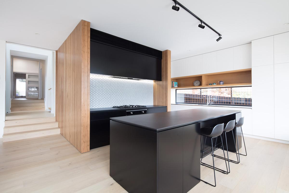 The entrance definitely makes an impact in this Ivanhoe pad. With a double-height entrance space that was created in the middle of the house and provides a clean separation between existing and new. As soon as you walk in the front door, your eye is drawn up to the circular skylight which casts directed light to the open stairs below.