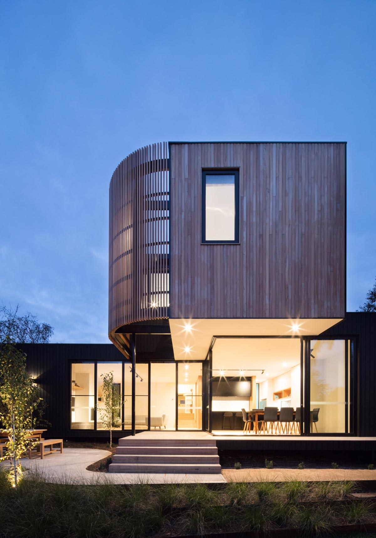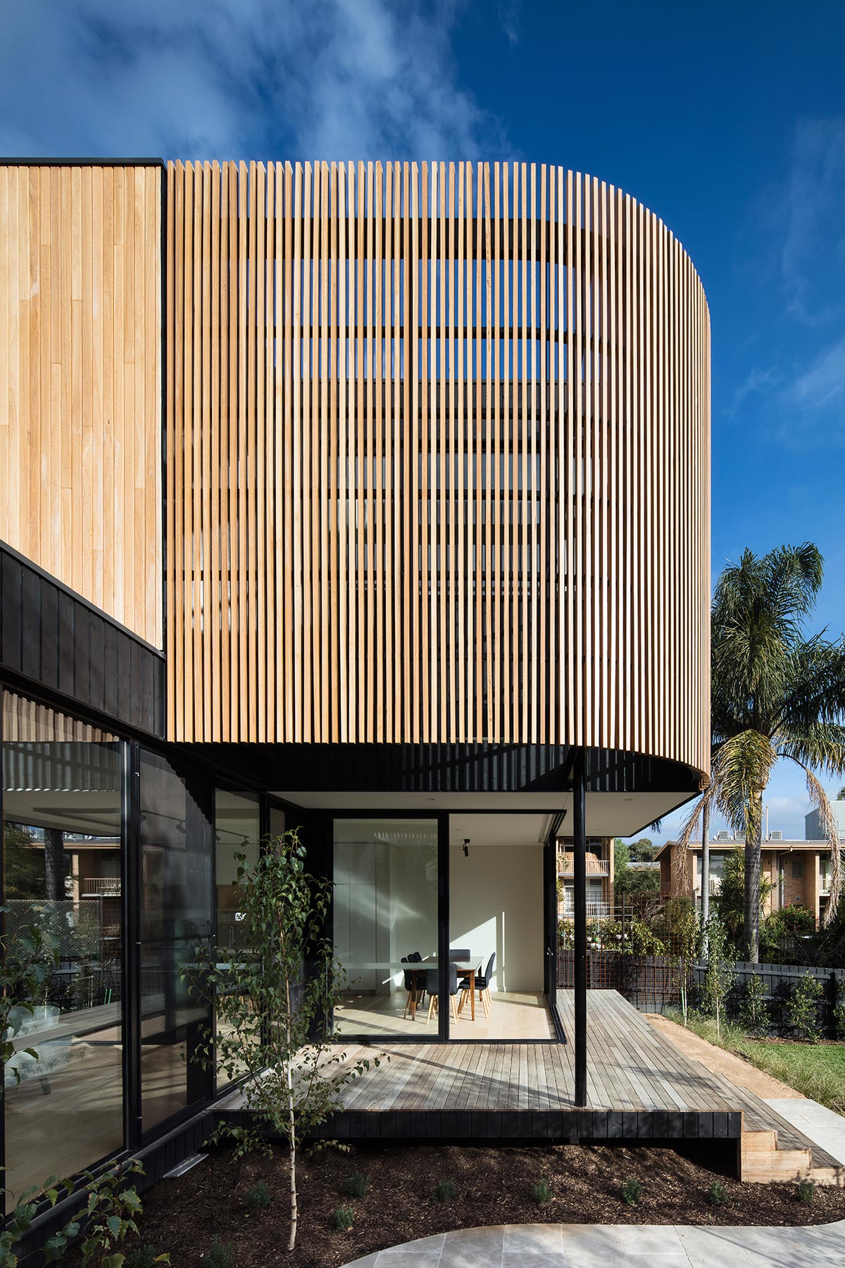 Sustainably-sourced Blackbutt timber, dark-stained timber and Colorbond Diversaclad marry in harmony in this home. But the personality of the home starts when the timber forms begin to curve to create a battened screen. The screen isn’t just for good looks (although it is damn pretty) but is also provides additional sun shading and privacy (so there are no peeping neighbour issues).